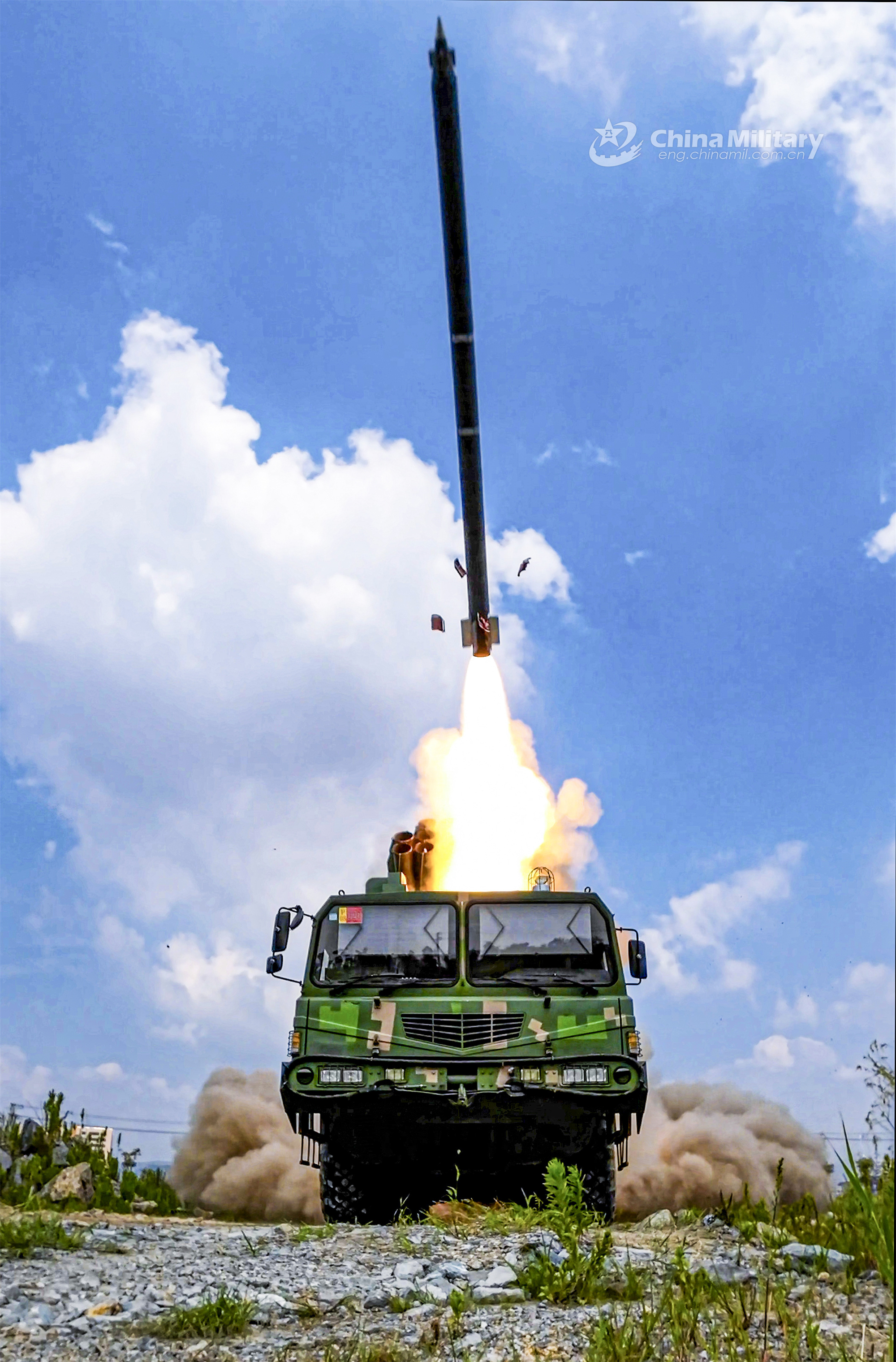 A long-range vehicle-mounted rocket system attached to a brigade of the PLA 73rd Group Army launches rocket to hit the "enemy" command post during an unscripted live-fire training exercise on August 18, 2023. (eng.chinamil.com.cn/Photo by Li Zhenjie)