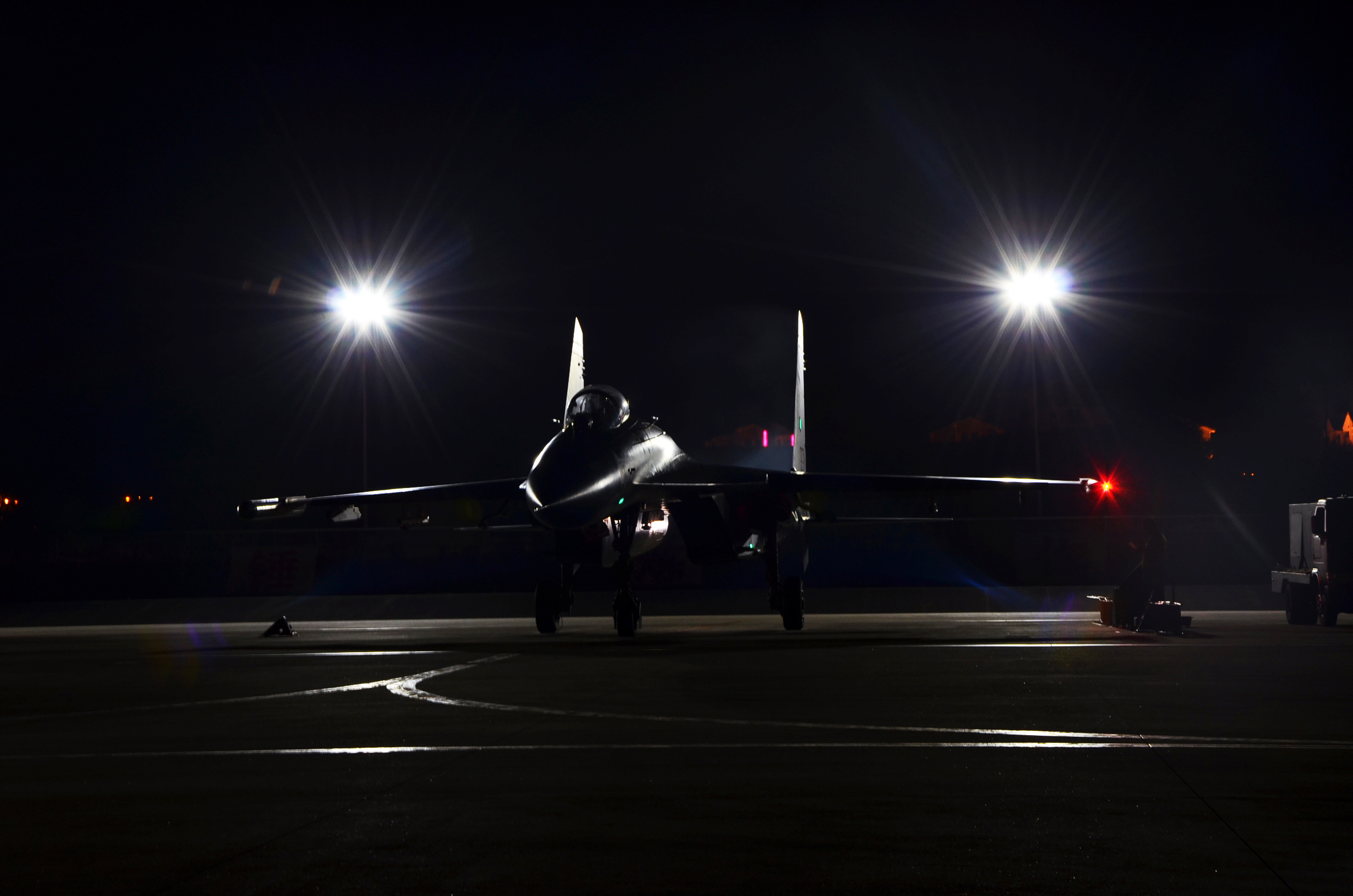 A J-11 fighter jet attached to an aviation brigade of the air force under the PLA Eastern Theater Command taxies on the runway before takeoff for a night sortie during a round-the-clock flight training exercise on January 24, 2018. (eng.chinamil.com.cn/Photo by Fu Gan)