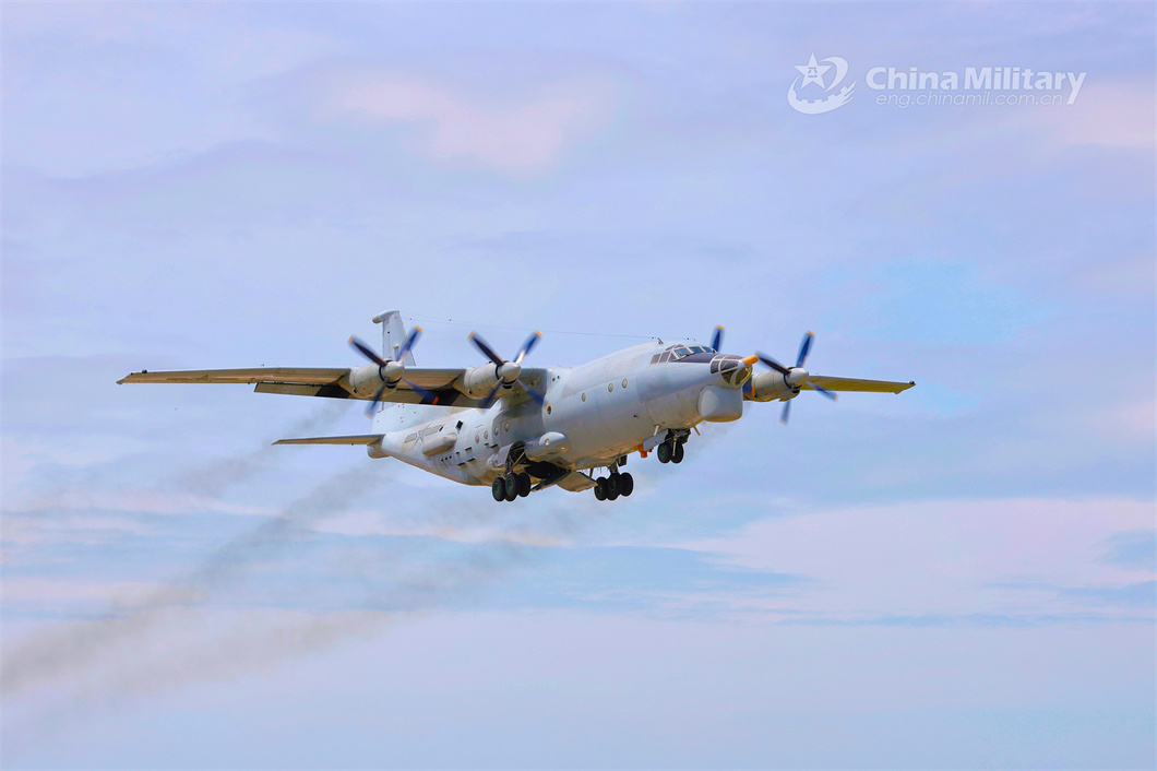 A reconnaissance aircraft attached to a PLA naval aviation regiment takes off for a round-the-clock flight training exercise. (eng.chinamil.com.cn/Photo by Yang Kaikai)