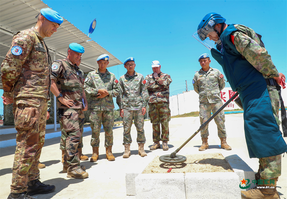 An EOD operator conducts simulated mine-clearing demonstration to Peyrecave, the J3 Chief of the UNIFIL. (Photo/81.cn).