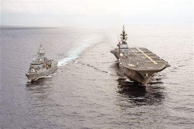 澳大利亚皇家海军安扎克级护卫舰(左)与日本海上自卫队出云级直升机驱逐舰进行联合演训。