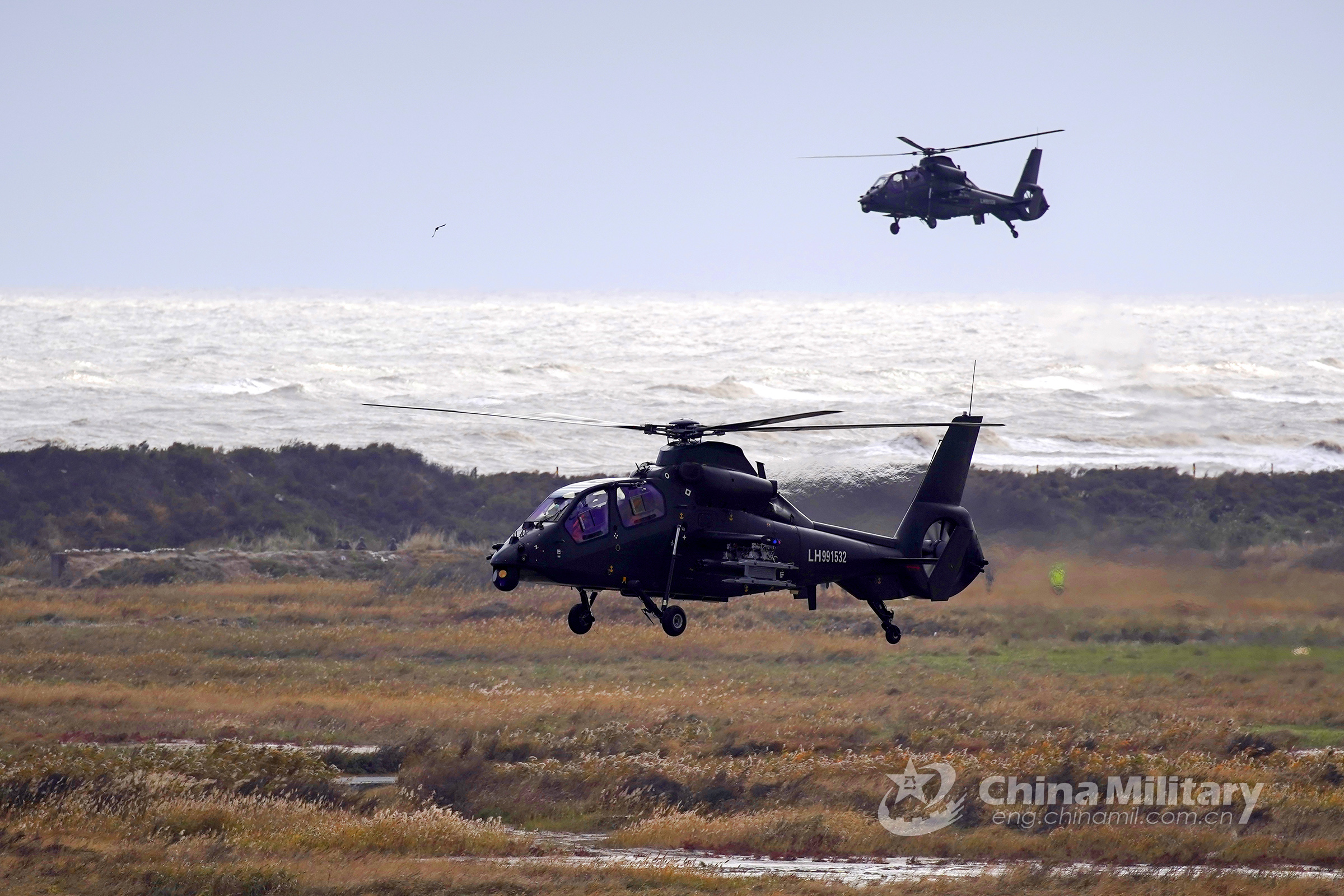 Helicopters attached to an army aviation brigade under the PLA 71st Group Army conduct ultra-low altitude defense penetration operations in flight training on November 13, 2022. (eng.chinamil.com.cn/Photo by Xiang Xu)