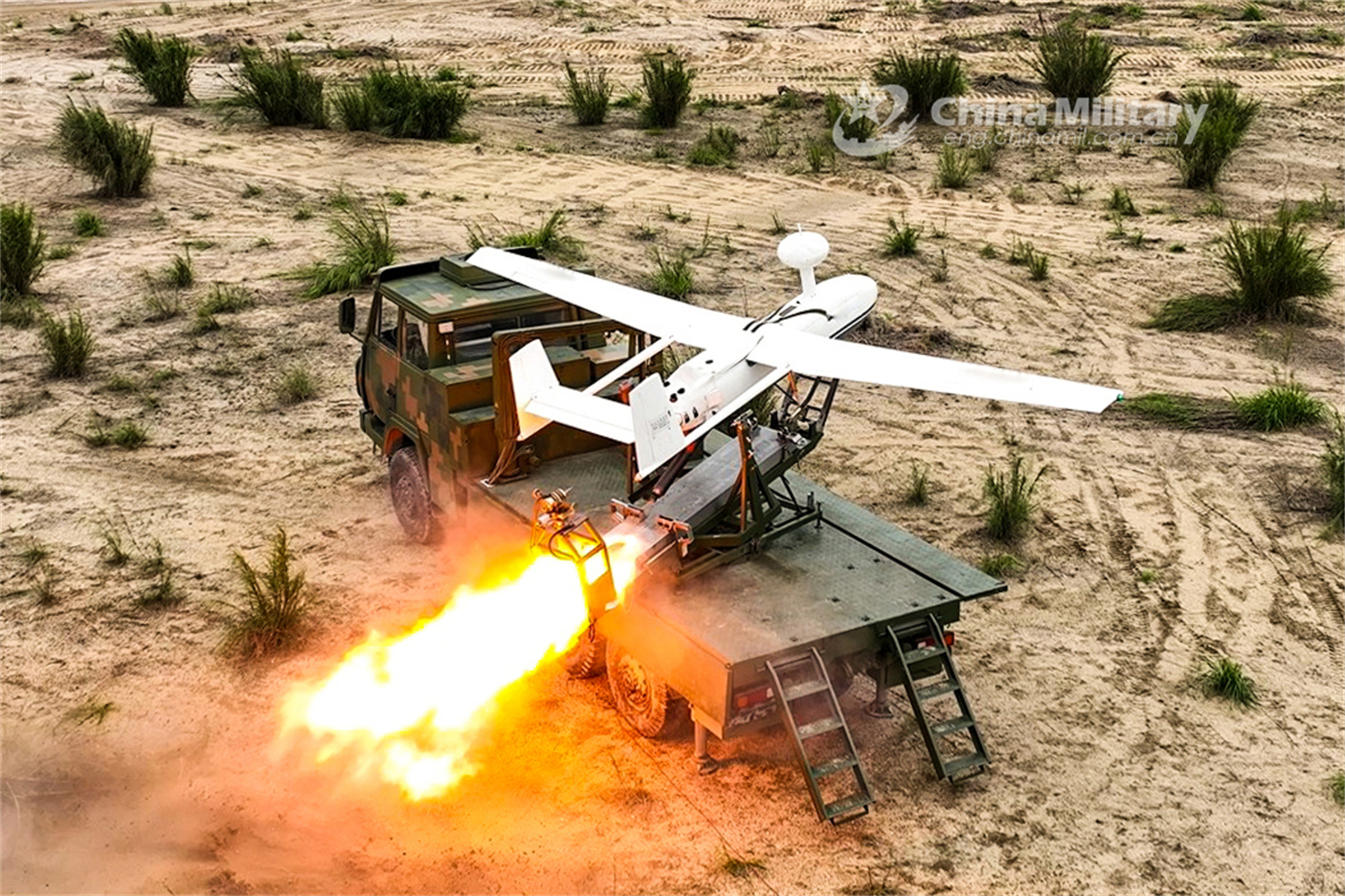 An unmanned aerial vehicle (UAV) attached to a brigade under the PLA 82nd Group Army is launched for a recent flight training exercise. (eng.chinamil.com.cn/Photo by Liu Kui)