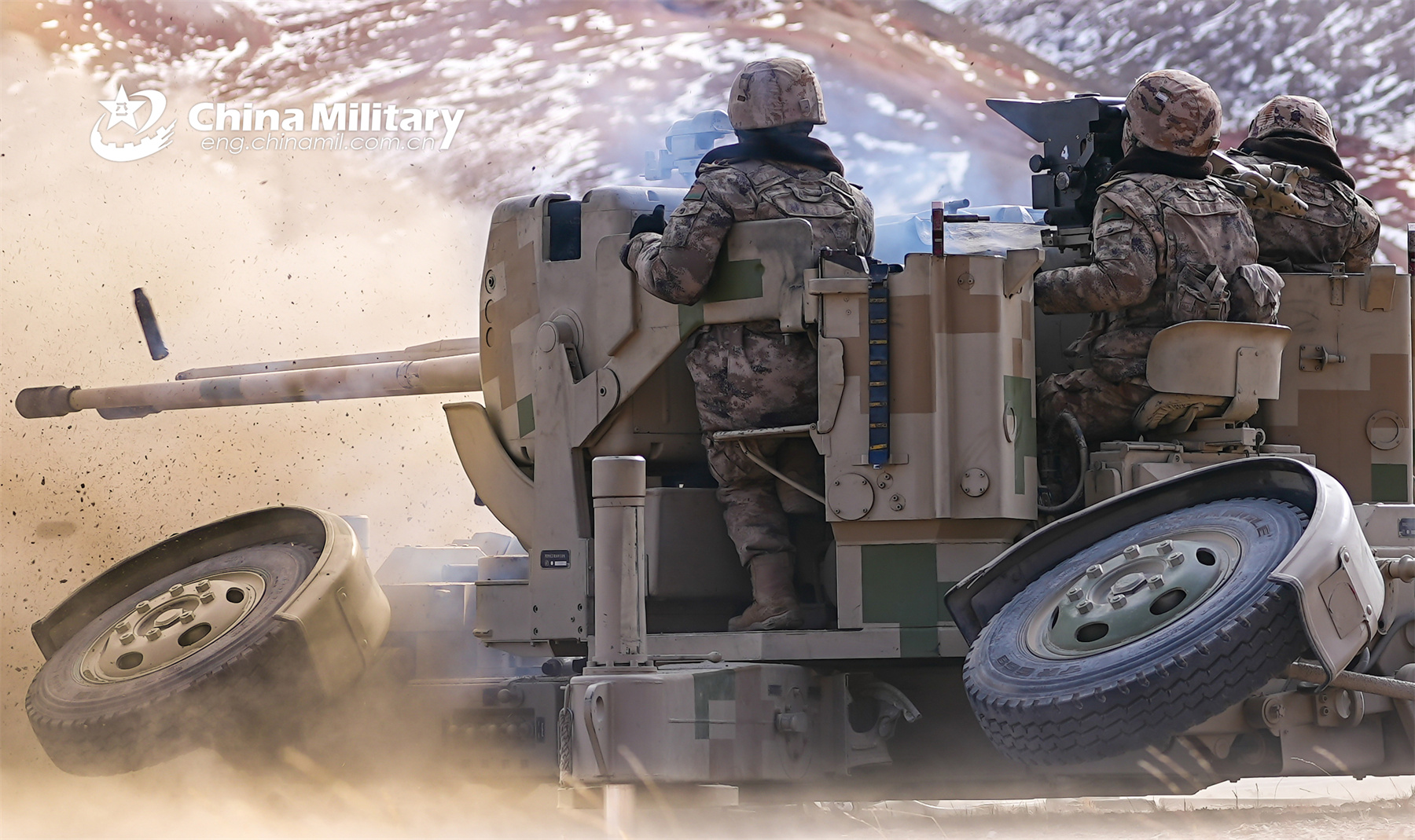 Artillerymen assigned to an air defense element of a combined-arms regiment under the PLA Xinjiang Military Command operate an anti-aircraft artillery system to attack mock targets during a live-fire test in late November, 2023.(eng.chinamil.com.cn/Photo by Zhou Kaiwei)