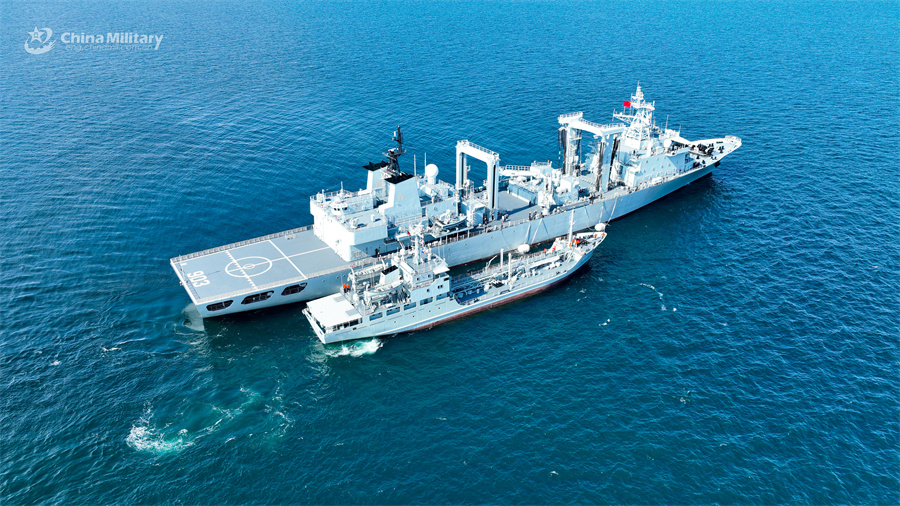 Type 903A comprehensive supply ship Kekexilihu (Hull 903) attached to a combat support ship flotilla of the navy under the Chinese PLA Northern Theater Command provides liquid supply to a ship via alongside replenishment-at-sea during a multi-subject maritime training exercise in the Yellow Sea on August 18th, 2024. (eng.chinamil.com.cn/Photo by Zhao Junling)