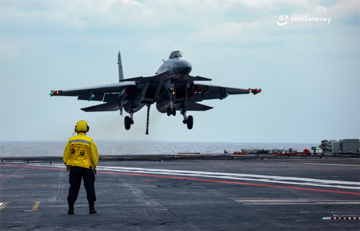 A fighter jet attached to the Navy of Chinese People's Liberation Army (PLA) prepares to taxi down the flight deck of aircraft carrier during a far-sea training exercise. Two Chinese PLA Navy's aircraft carrier task forces, Liaoning (Hull 16) and Shandong (Hull 17), recently completed their combat-oriented far-sea training and safely returned to their home ports. (eng.chinamil.com.cn/Wang Yuanlin)近日,海军辽宁舰、山东舰航母编队组织远海实战化训练。图为舰载战斗机着舰。(英文中国军网/王园林 摄)