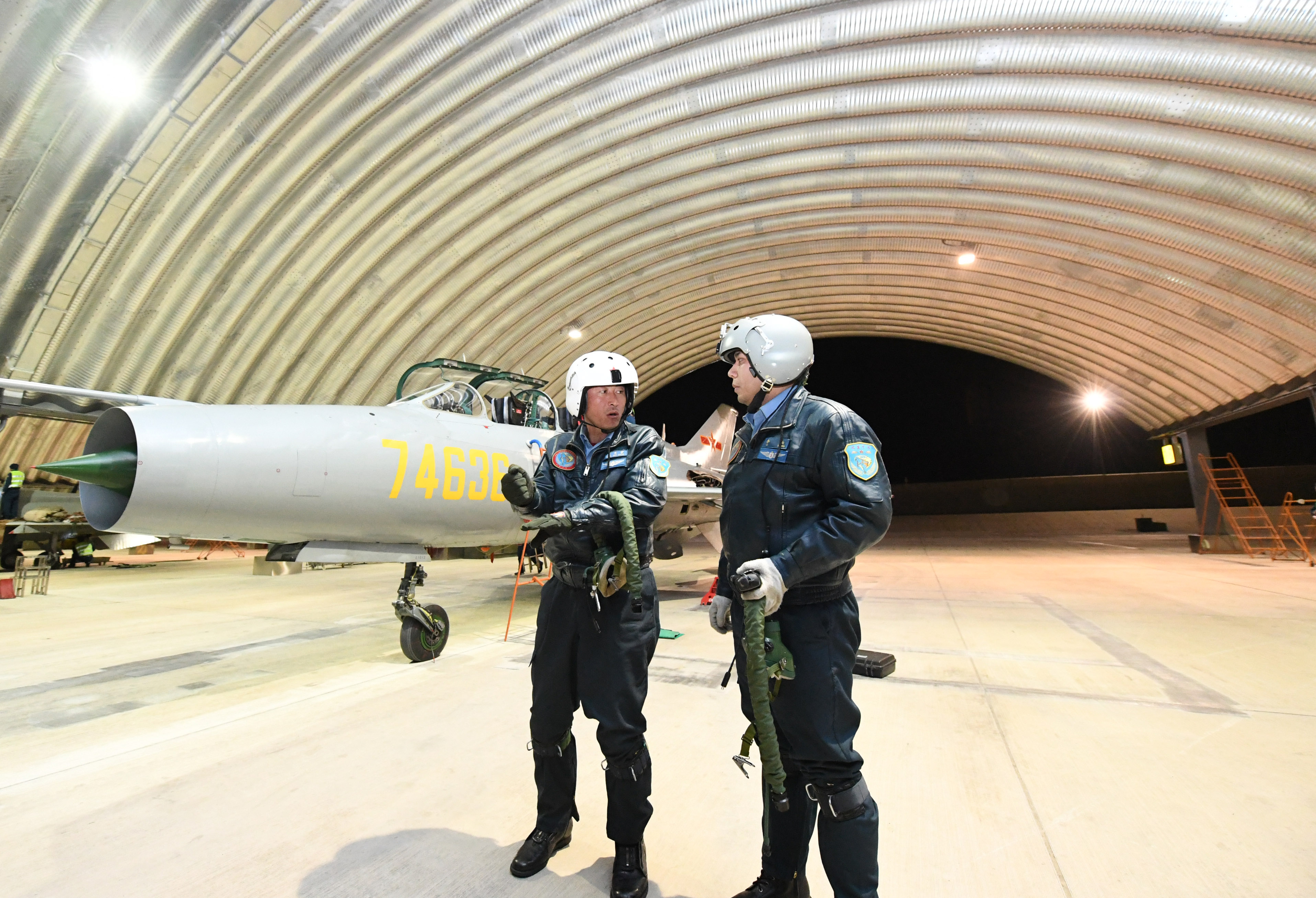 Pilots assigned to an aviation brigade of the air force under the PLA Southern Theater Command share experience in an aircraft hangar after completing a night flight training exercise on January 22, 2018. (eng.chinamil.com.cn/Photo by Zhang Hengping)