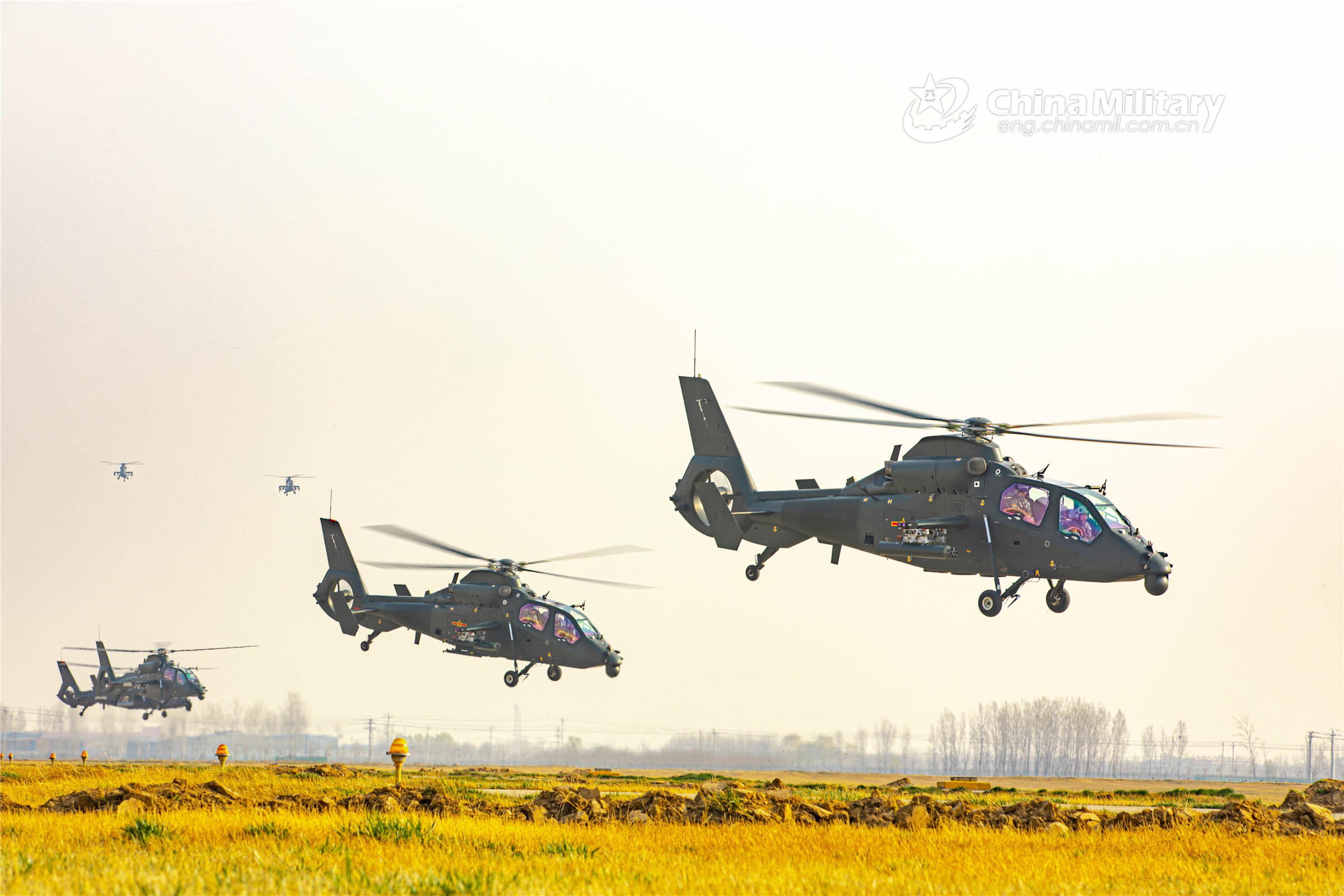 Helicopters attached to an army aviation brigade under the PLA 80th Group Army lift off in formation for a flight training exercise on March 23, 2022. (eng.chinamil.com.cn/Photo by Li Peng)