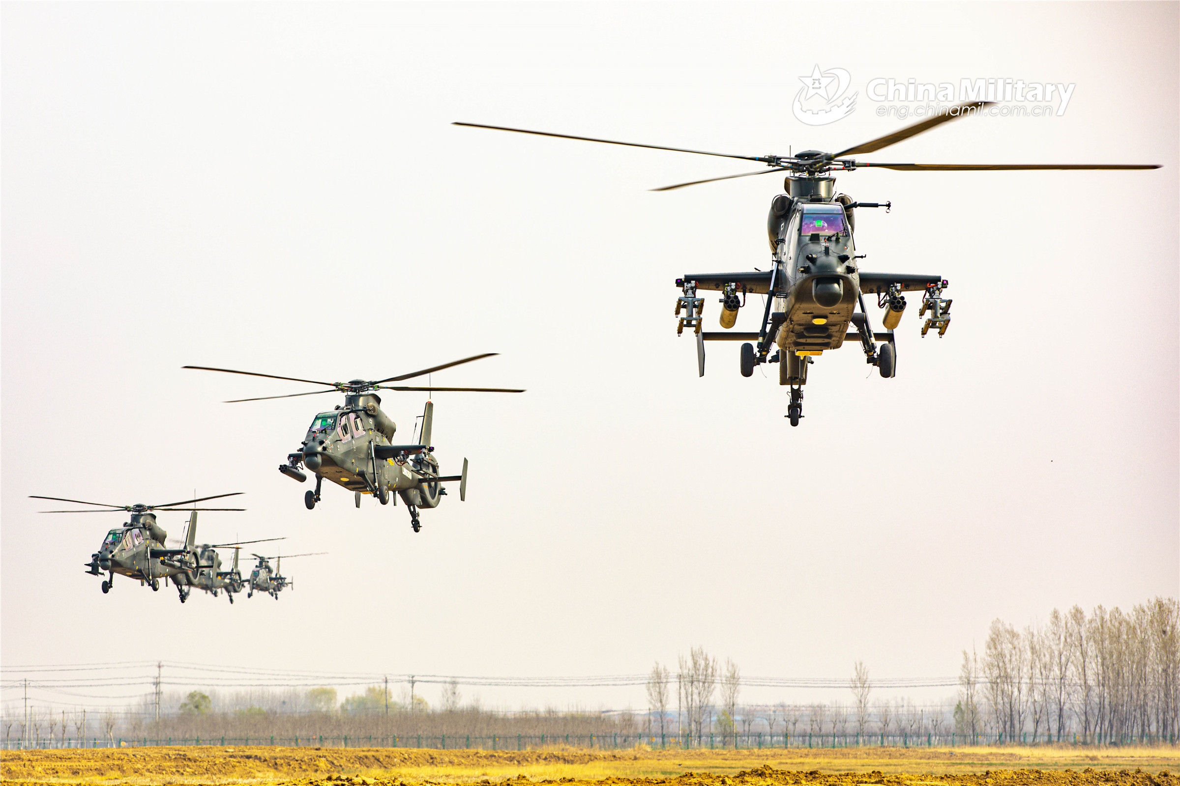 Helicopters attached to an army aviation brigade under the PLA 80th Group Army lift off in formation for a flight training exercise on March 23, 2022. (eng.chinamil.com.cn/Photo by Li Peng)