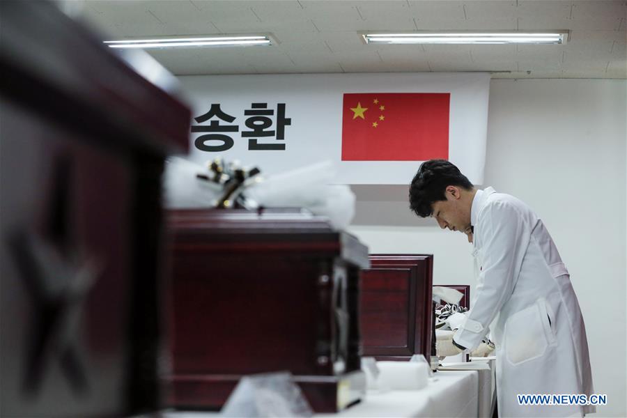 Workers prepare the remains of Chinese soldiers killed in the 1950-53 Korean War, in Incheon, the Republic of Korea, April 1, 2019. The remains of more Chinese soldiers killed in the 1950-53 Korean War will be returned to China from the Republic of Korea (ROK) on April 3, 2019, according to China's Ministry of Veterans Affairs (MVA) . It will be the sixth batch of remains of Chinese soldiers returned following a handover agreement signed by the two countries. From 2014 to 2018, the remains of 589 soldiers were returned to China from the ROK, official figures show. (Xinhua/Wang Jingqiang)