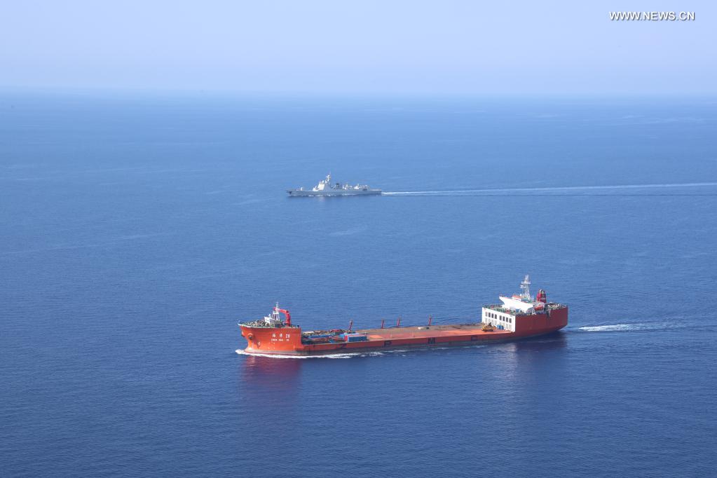 Photo taken on May 28, 2021 shows a Chinese merchant vessel being escorted by missile destroyer Changsha (rear) of China's 37th naval escort fleet. A Chinese naval fleet returned to a military port in Zhanjiang on June 29, after concluding escort missions in the Gulf of Aden and the waters off Somalia. (Photo by Wang Jian/Xinhua)