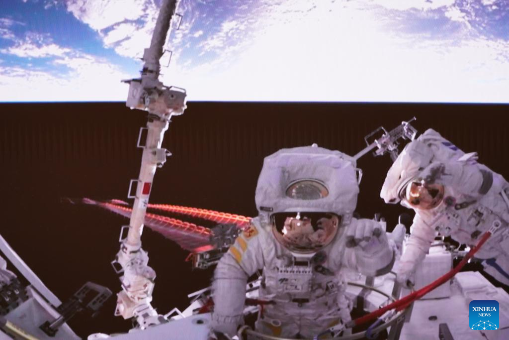 Under the coordination between space and Earth, and coordination with astronaut Cai Xuzhe inside the lab module, the pair completed a series of tasks, including the installation of the extended pump set of the Wentian lab module, lifting the lab module's panoramic camera, and the verification of capability for independent transfer and emergency return to the spacecraft. (Photo by Li Jie/Xinhua)