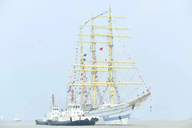 The Indonesian Navy's sail training ship Kri Bima Suci pulls into a military port in Shanghai on September 6, 2024. (Photo by Geng Haipeng)