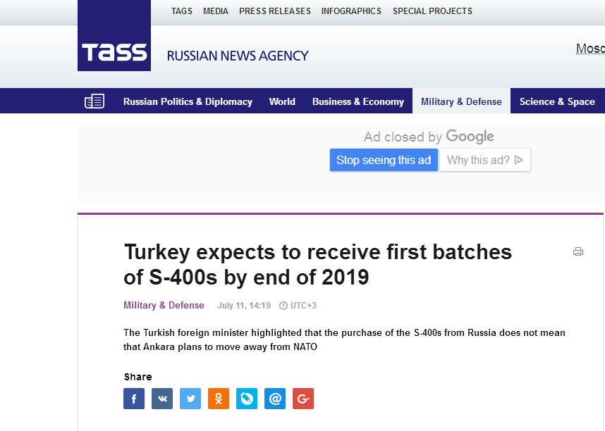 BRUSSELS, July 11. /TASS/. Turkey expects to receive the first batches of the S-400 anti-aircraft missile systems before the end of the next year, Turkish Minister of Foreign Affairs Mevlut Cavusoglu said at a NATO forum in Brussels on Wednesday, Anadolu Agency reported.