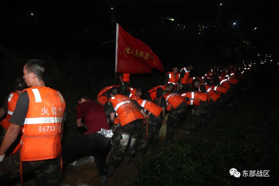 Soldiers from a brigade under the PLA Rocket Force in overnight flood control.