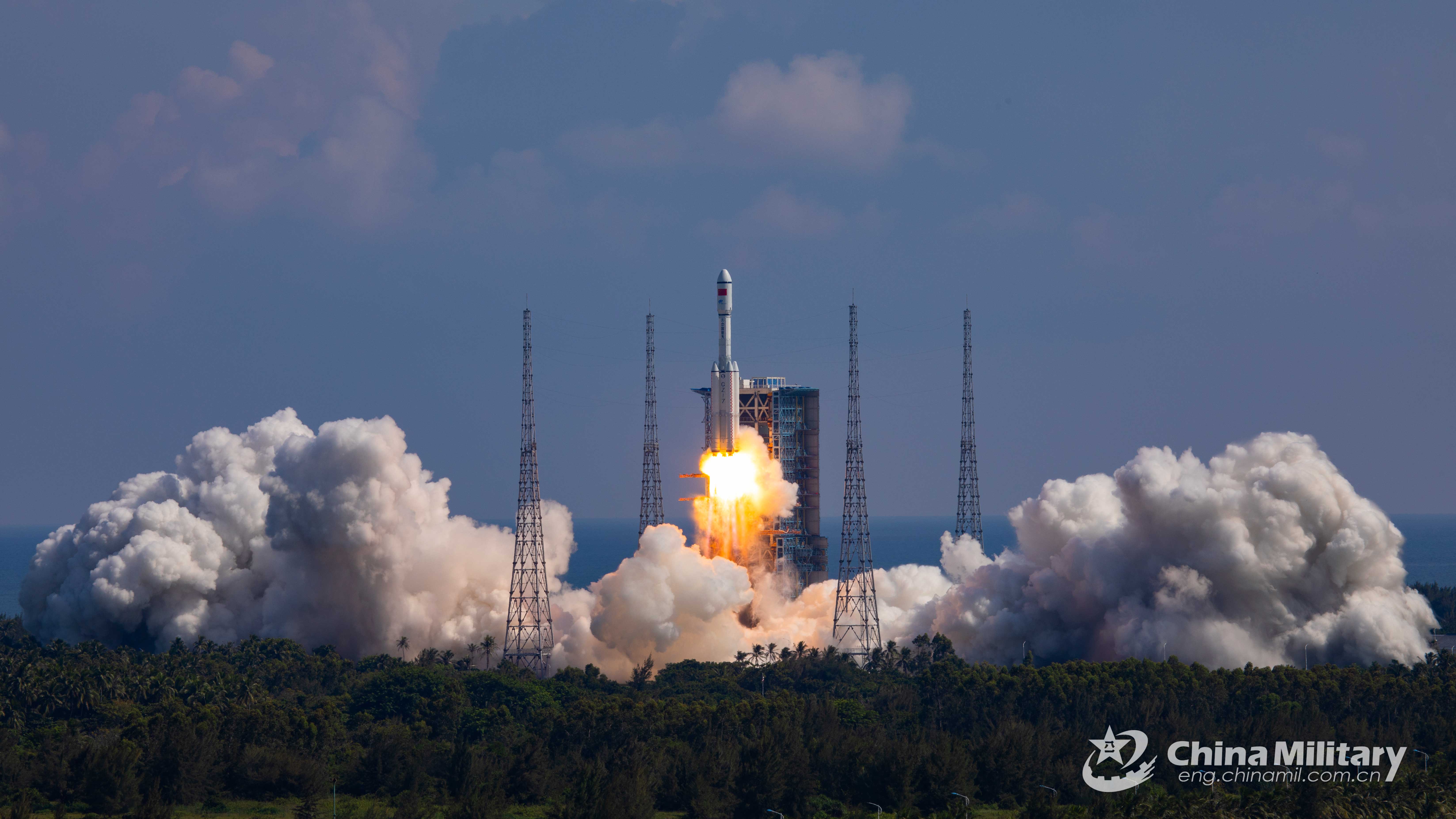The Long March-7 Y4 rocket, carrying Tianzhou-3, blasts off from the Wenchang Spacecraft Launch Site in south China's Hainan Province, Sept. 20, 2021. China launched cargo spacecraft Tianzhou-3 on Monday to deliver supplies for its under-construction space station. (eng.chinamil.com.cn/Photo by Yuan Fanglei)