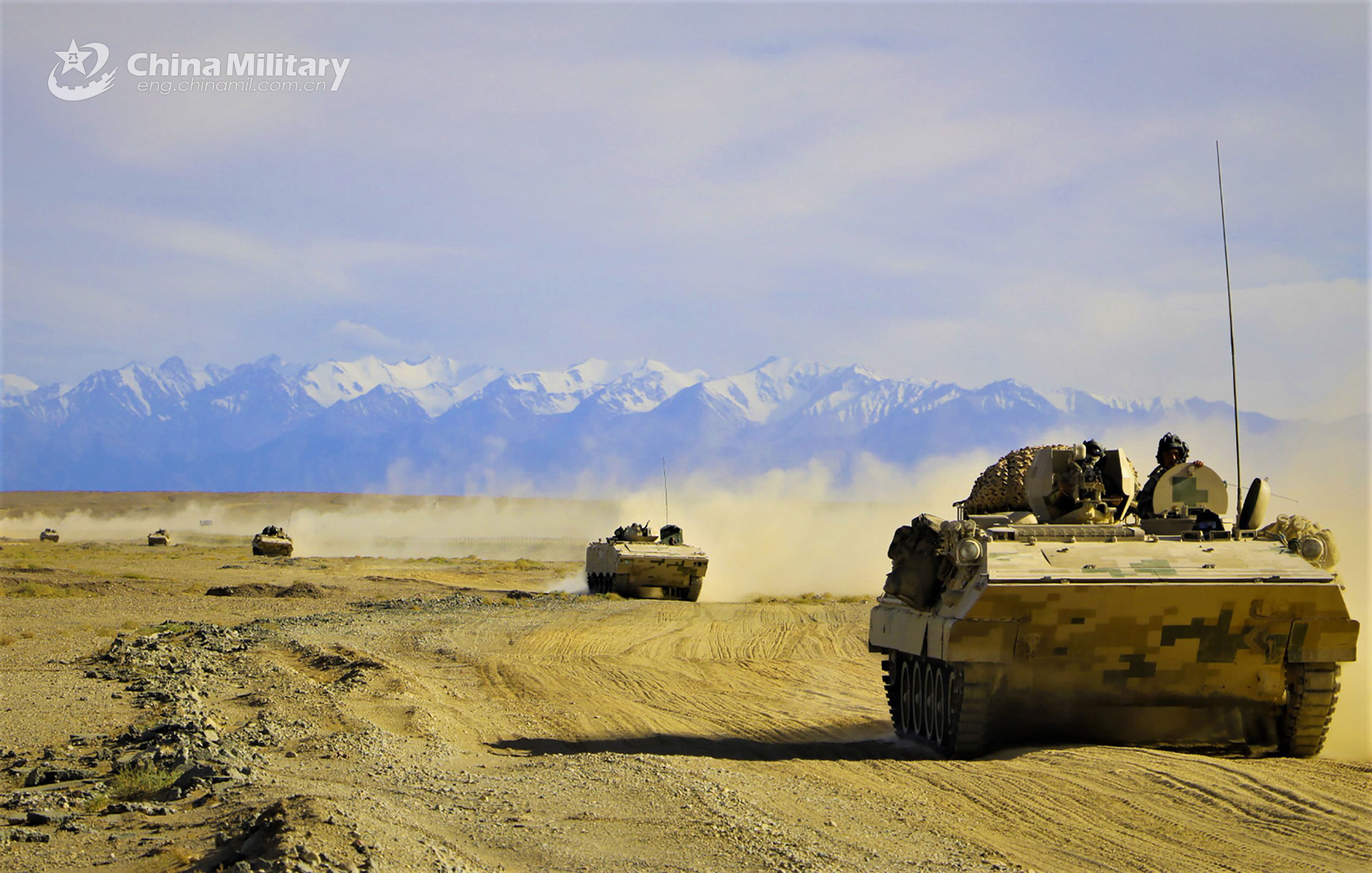 Armored vehicles attached to a combined-arms brigade under the PLA 77th Group Army march in formation during a maneuver training exercise in the Gobi desert on September 17, 2021. (eng.chinamil.com.cn/Photo by Zhang Weiyan)