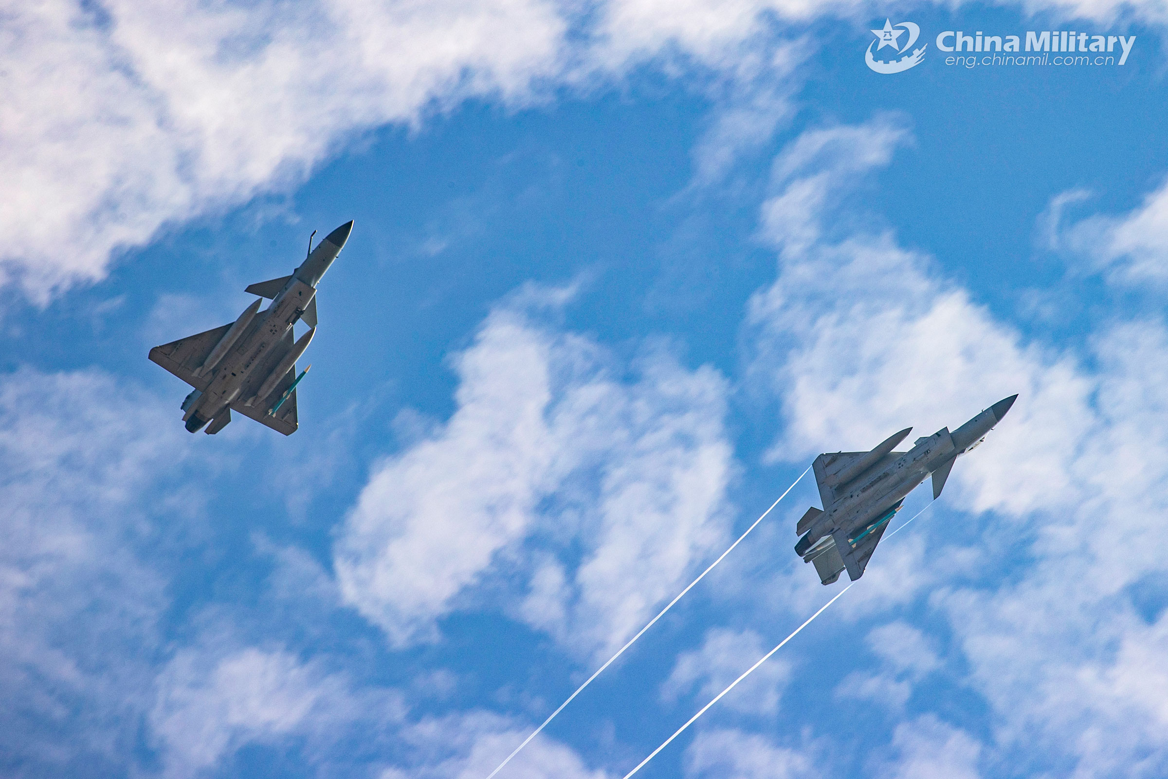 Two fighter jets attached to an aviation brigade of the air force under the PLA Southern Theater Command soar into the sky during a round-the-clock training exercise on March 8, 2022. (eng.chinamil.com.cn/Photo by Wang Guoyun)