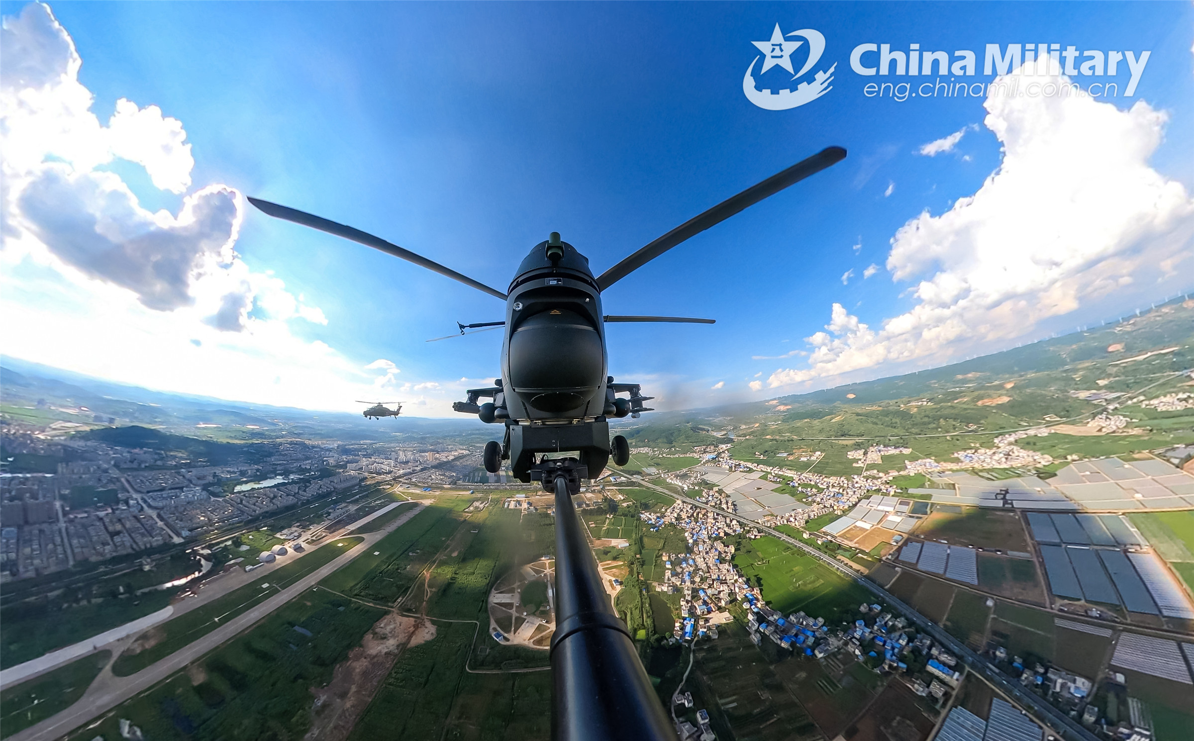 A helicopter attached to a brigade under the PLA 75th Group Army steadily flies in a recent real-combat flight training exercise. (eng.chinamil.com.cn/Photo by Sun Changyi)