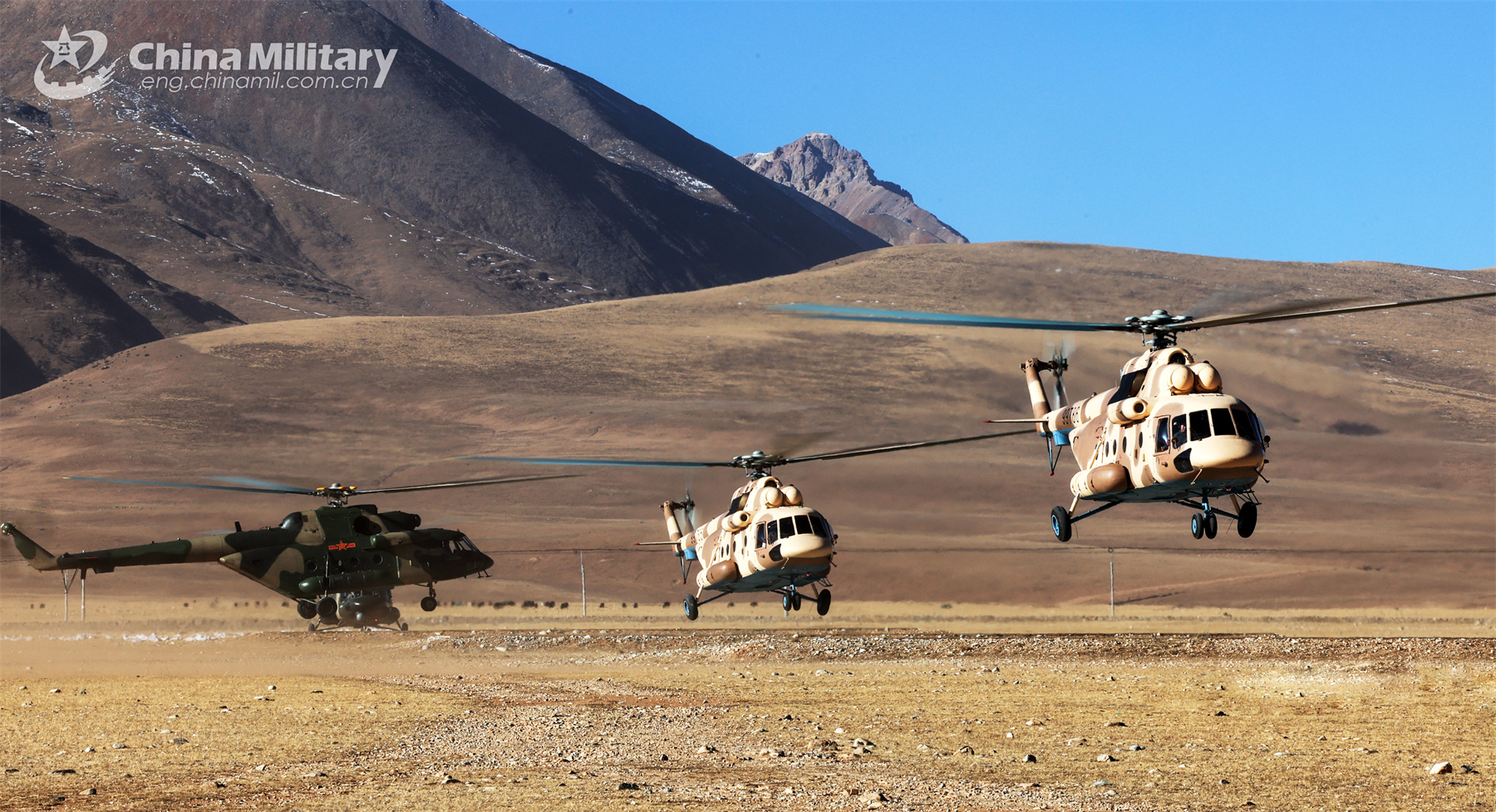 Multiple types of helicopters attached to an army aviation brigade under the PLA Xizang Military Command engage in flight training drills on tactical formation flight, field lift-off and landing, distant transportation and others in early December, 2023. (eng.chinamil.com.cn/Photo by Hu Qiwu)
