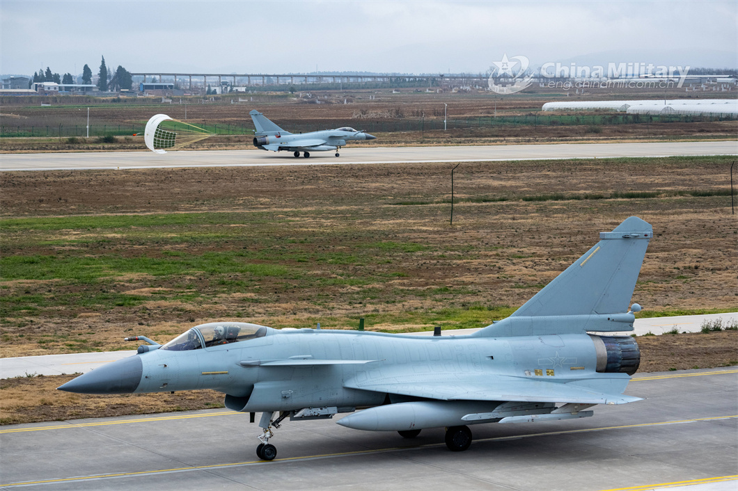 A J-10 fighter jet attached to an aviation brigade with the air force under the PLA Southern Theater Command speeds up before takeoff as another one taxies down the runway with drogue parachute after landing during a flight training exercise under complex conditions on February 24, 2024. (eng.chinamil.com.cn/Photo by Shang Yanjie)