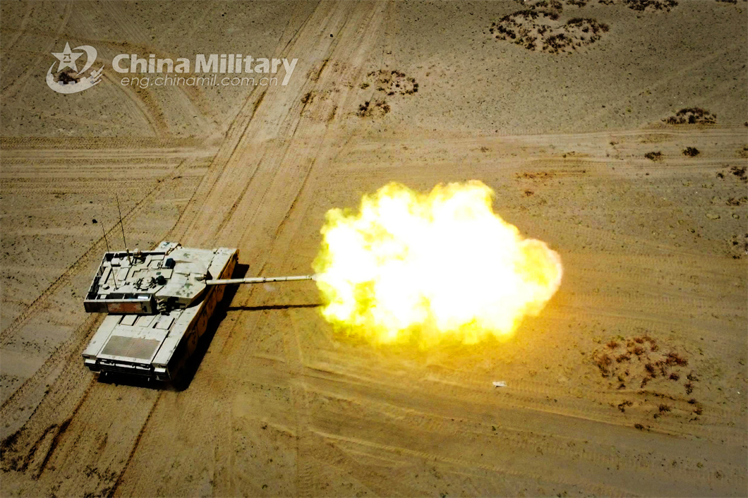 A Type-99A main battle tank attached to a combined-arms brigade under the PLA 76th Group Army fires at targets during a training exercise near the Qilian Mountains in northwest China's Gansu Province on April 3, 2024. (eng.chinamil.com.cn/Photo by Hu Fulin)