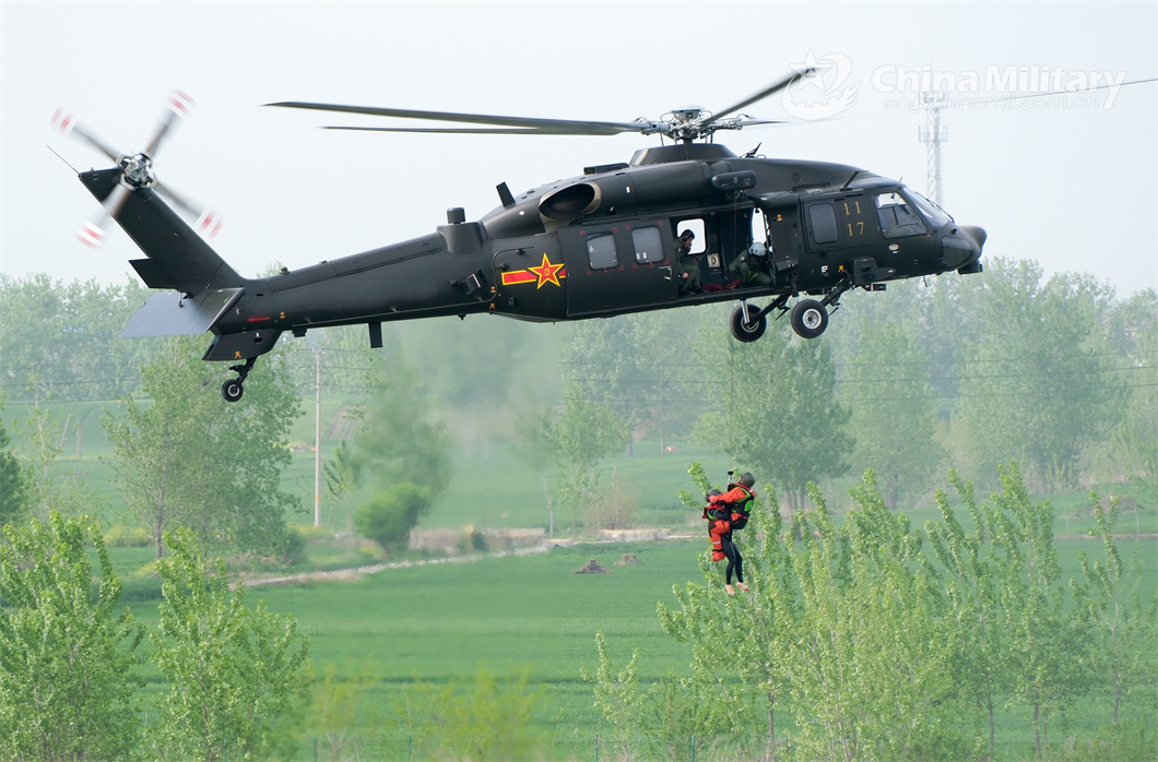 A Z-20 helicopter attached to a brigade under the PLA 71st Group Army hovers above water while lifting up the lifeguard and a drowning person during a hoist rescue training exercise on May 3, 2024. (eng.chinamil.com.cn/Photo by Wang Kunpeng)
