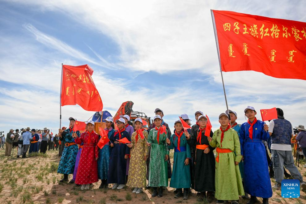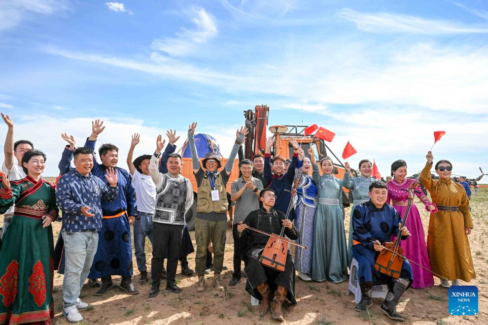Artists of Ulan Muqir celebrate at the retrieval site of the return capsule of the Chang'e-6 probe in Siziwang Banner, north China's Inner Mongolia Autonomous Region, June 25, 2024.