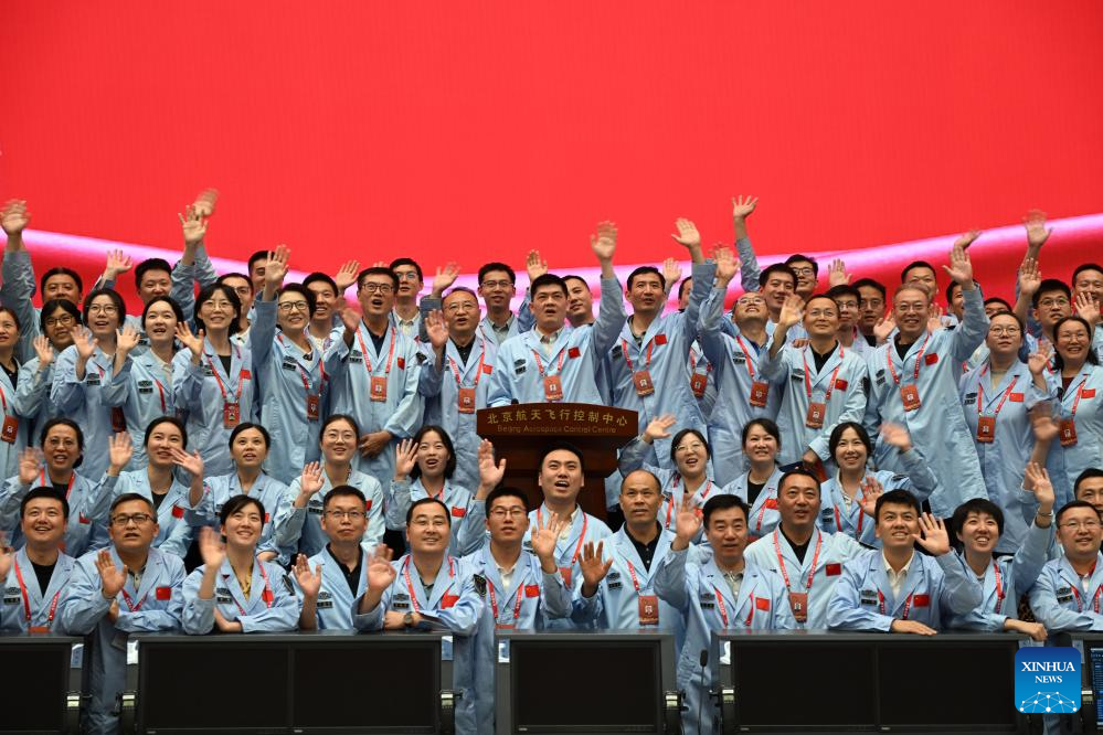 (240625) -- BEIJING, June 25, 2024 (Xinhua) -- Staff members pose for a group photo as the Chang'e-6 mission successfully completed at Beijing Aerospace Control Center in Beijing, capital of China, June 25, 2024.