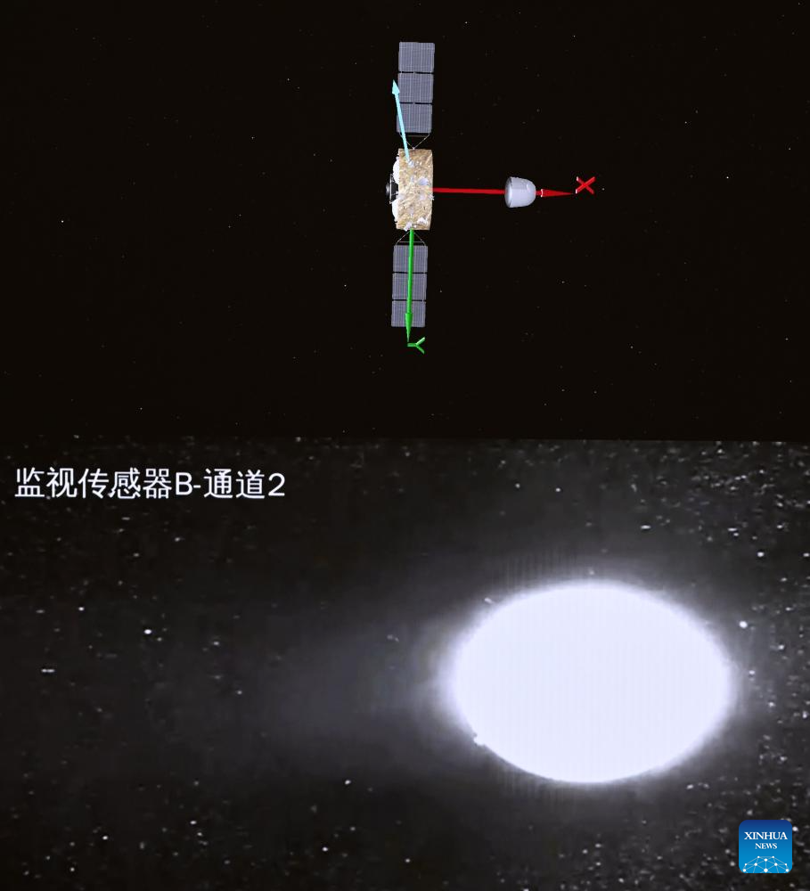 This image taken from video animation at Beijing Aerospace Control Center on June 25, 2024 shows the returner of the Chang'e-6 probe after separating from the orbiter.