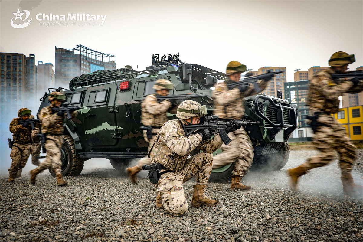 Special operations soldiers assigned to a detachment under the Chinese People's Armed Police (PAP) Force Guizhou Corps advance swiftly towards the targets during a recent comprehensive counter-terrorism exercise simulating a train hijacking scenario.(eng.chinamil.com.cn/Photo by Chen Dijie)