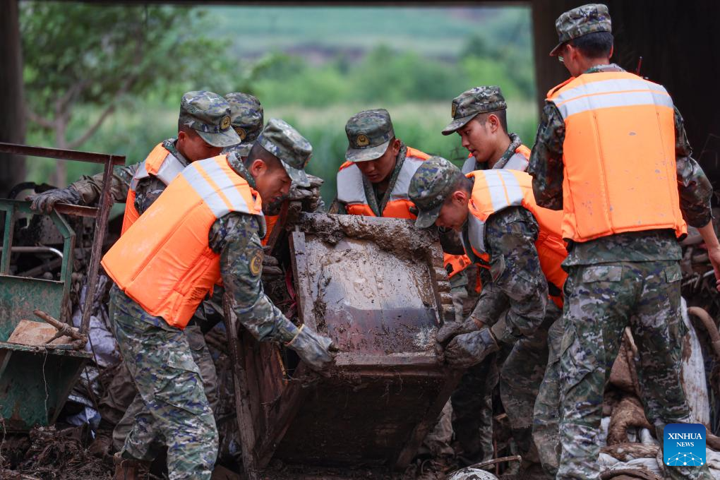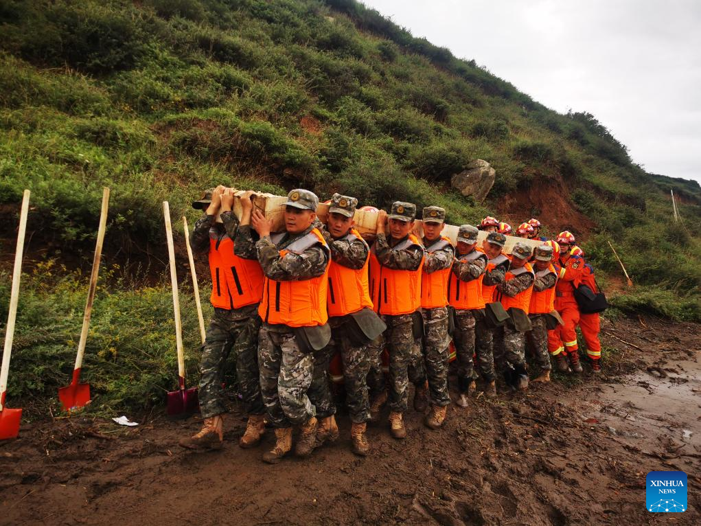 Rescuers work at the disaster-affected area of Mapo Township of Yuzhong County, Lanzhou City, northwest China's Gansu Province, Aug. 9, 2025. Rescue efforts are underway after continuous heavy rainfall triggered mountain torrents in Yuzhong County. (Photo by Zhang Xiangang/Xinhua)