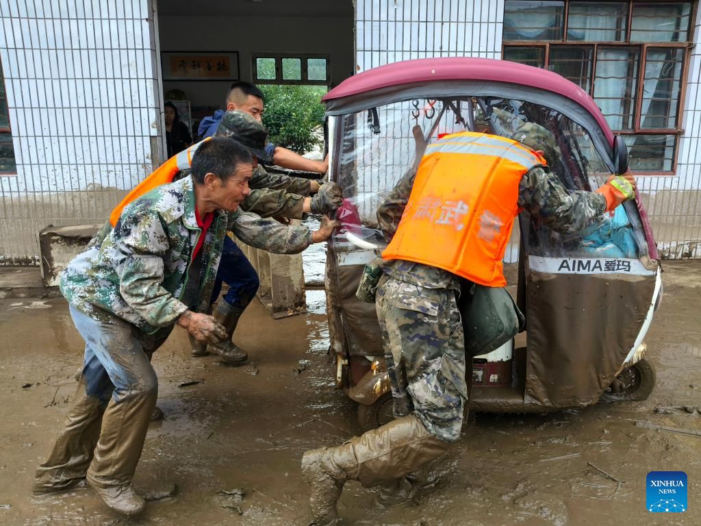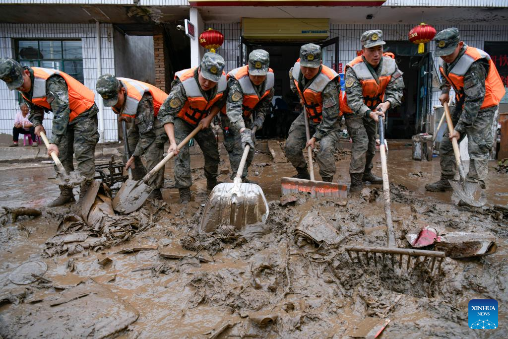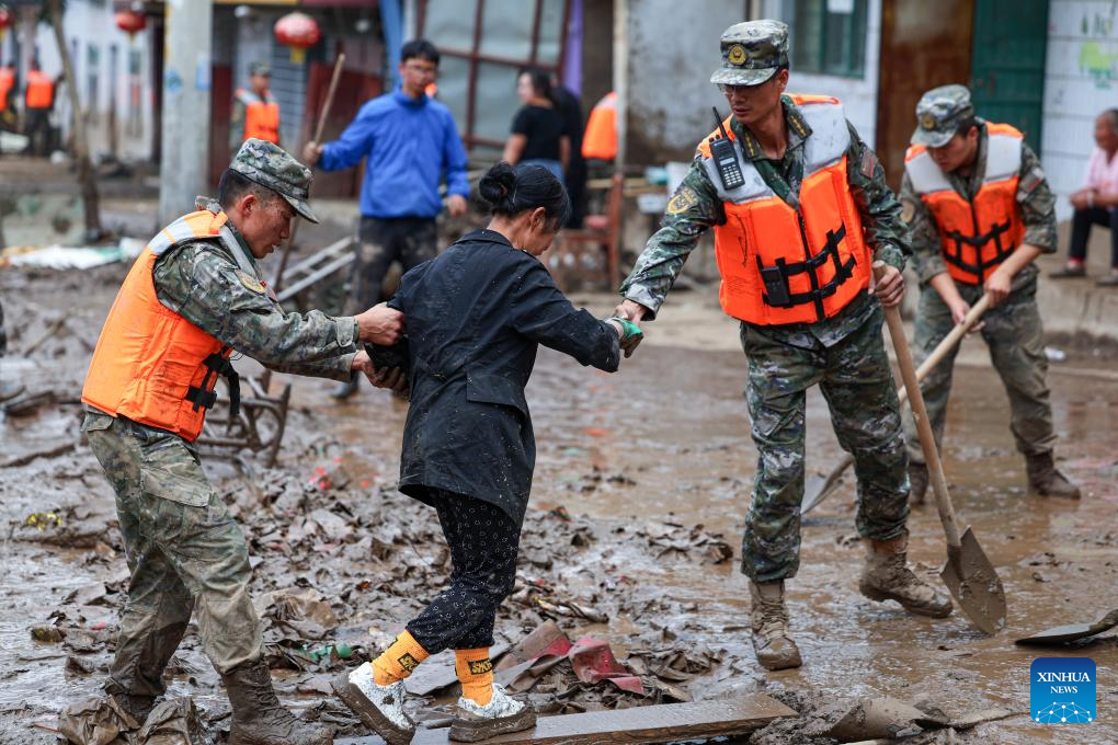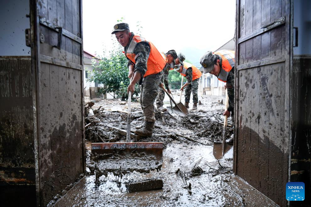 Rescuers clear debris outside the houses of disaster-affected villagers in Chengguan Town of Yuzhong County, Lanzhou City, northwest China's Gansu Province, Aug. 9, 2025. Rescue efforts are underway after continuous heavy rainfall triggered mountain torrents in Yuzhong County. (Photo by Hou Chonghui/Xinhua)