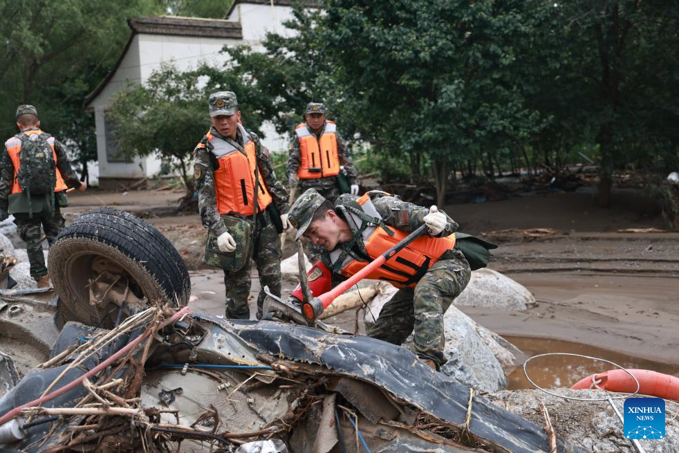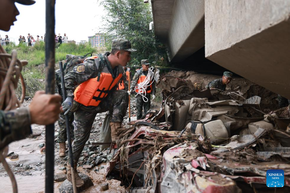 Rescuers search for lost belongings of disaster-affected villagers at a river channel of Yuzhong County, Lanzhou City, northwest China's Gansu Province, Aug. 9, 2025. Rescue efforts are underway after continuous heavy rainfall triggered mountain torrents in Yuzhong County. (Photo by Pei Wenkang/Xinhua)