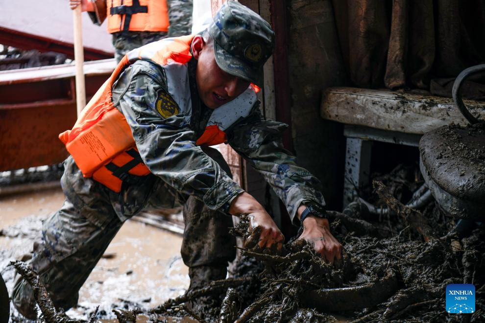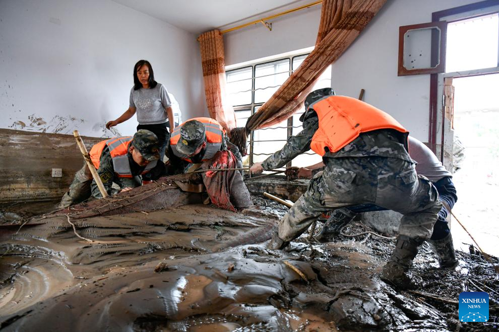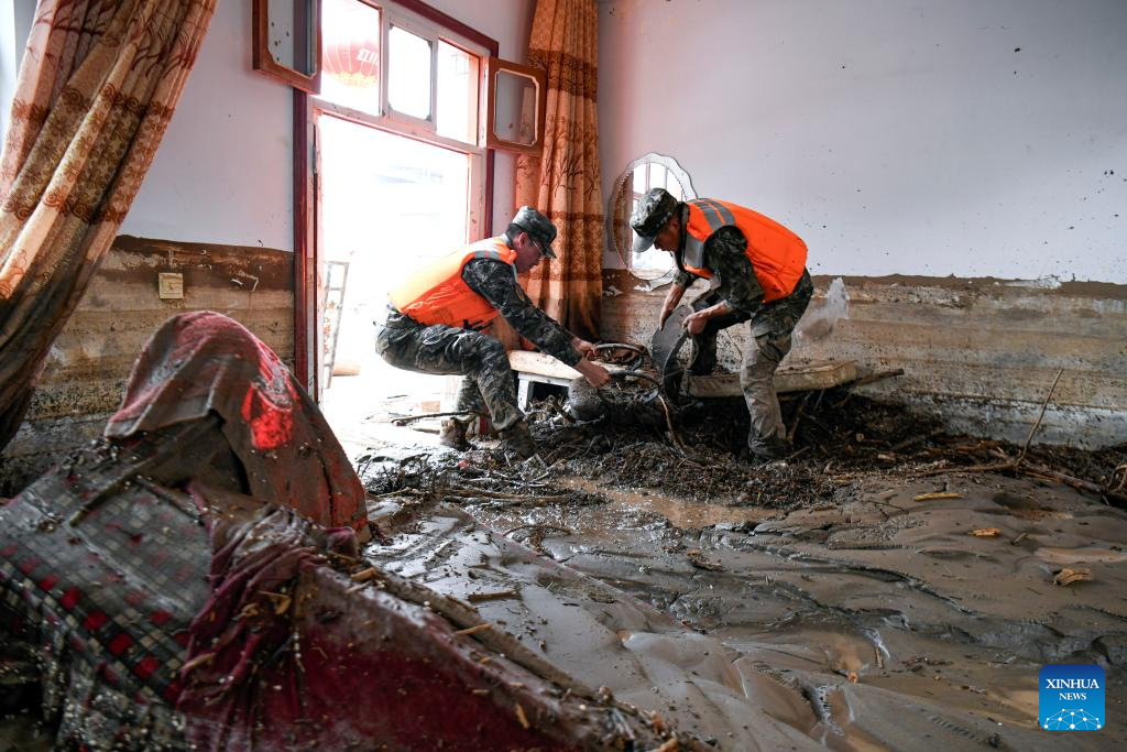 Rescuers clear debris inside the room of disaster-affected villagers in Chengguan Town of Yuzhong County, Lanzhou City, northwest China's Gansu Province, Aug. 9, 2025. Rescue efforts are underway after continuous heavy rainfall triggered mountain torrents in Yuzhong County. (Photo by Hou Chonghui/Xinhua)