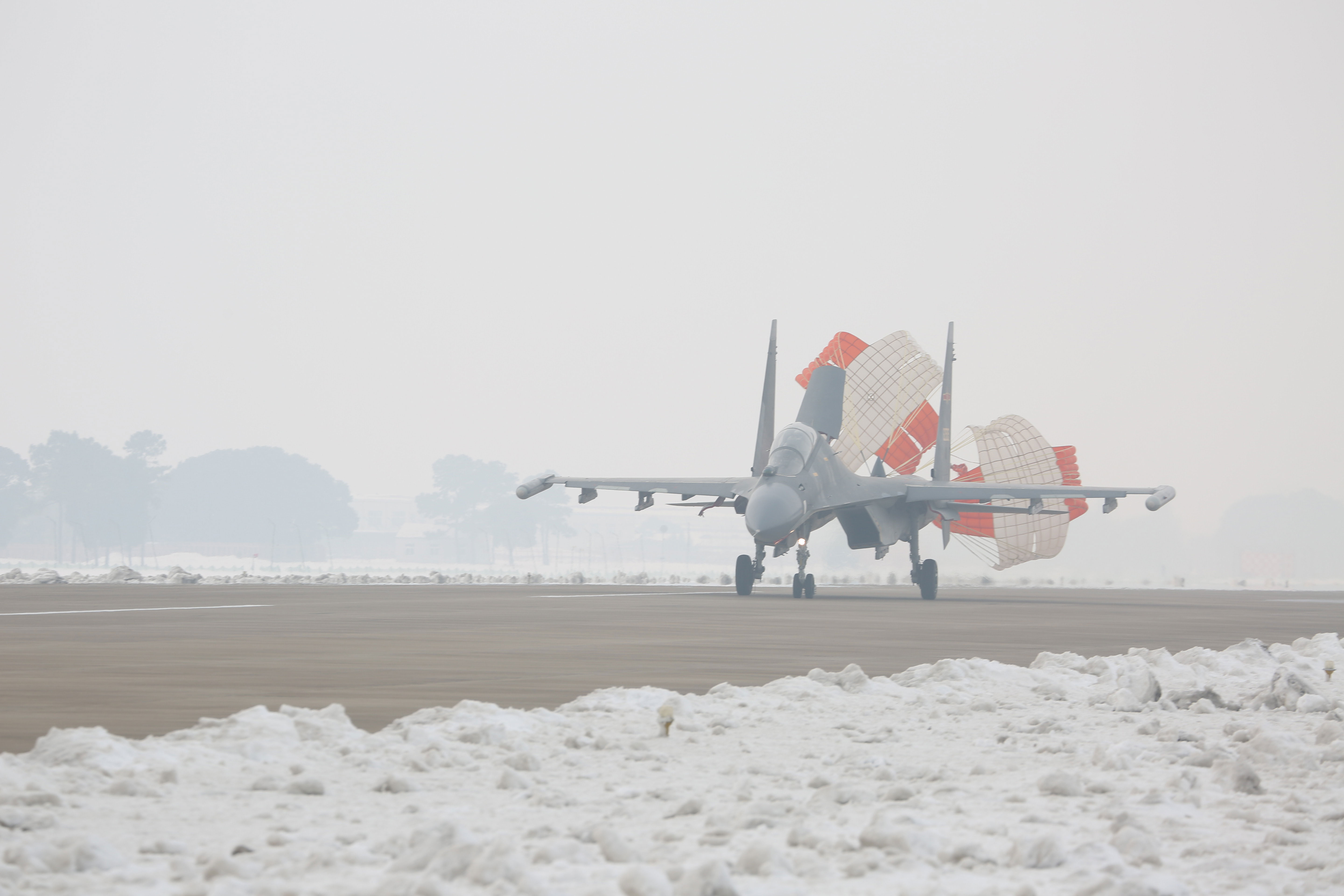 A Su-30 fighter jet attached to an aviation brigade of the air force under the PLA Eastern Theater Command deploys a drogue parachute to slow itself after landing at a military airfield during a flight training exercise after snow on January 29, 2018. (eng.chinamil.com.cn/Photo by Ding Yibo)