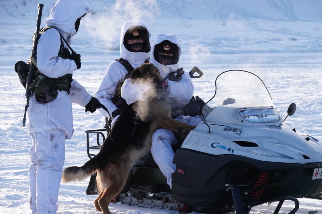 Soldiers are on patrol in Beiji Village of the border county Mohe, northeast China's Heilongjiang Province, Feb. 5, 2018. Soldiers stick to their post at the border in spite of the severe cold in Mohe where the temperature has dropped to minus 40 degrees Celsius. (Xinhua/Li Gang)