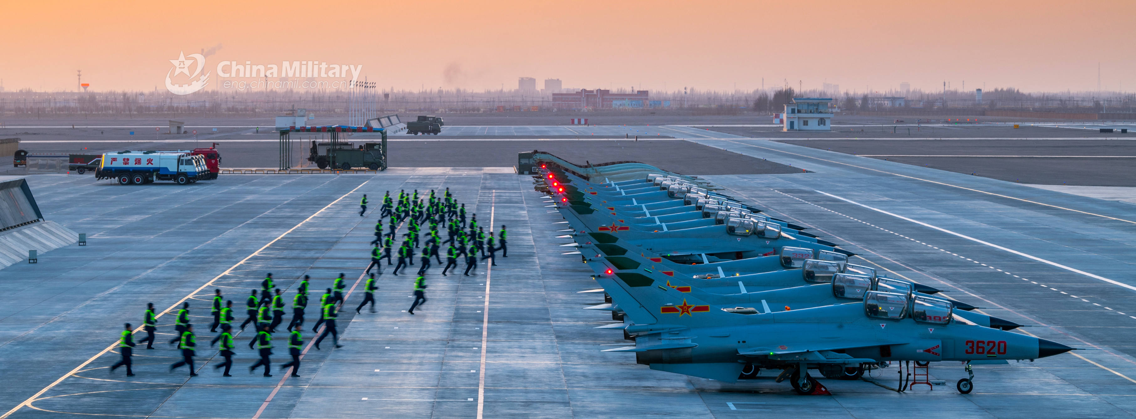 Ground crew members assigned to the PLA Air Force Xi'an Flying College rush to their positions as assembled fighter trainer aircraft sit abreast on the tarmac with each other prior to a night flight training course on March 12, 2020. (eng.chinamil.com.cn/Photo by Yan Tengfei)