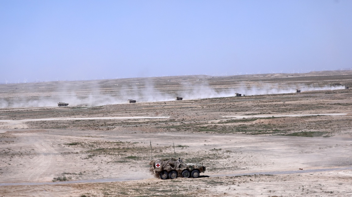 Military personnel conduct adaptive training for a joint military drill on Aug. 5, 2021. A joint military exercise by the Chinese and Russian armies will be held from Aug. 9 to 13 at a training base of the People's Liberation Army (PLA) in northwest China's Ningxia Hui Autonomous Region. (Xinhua/Liu Fang)