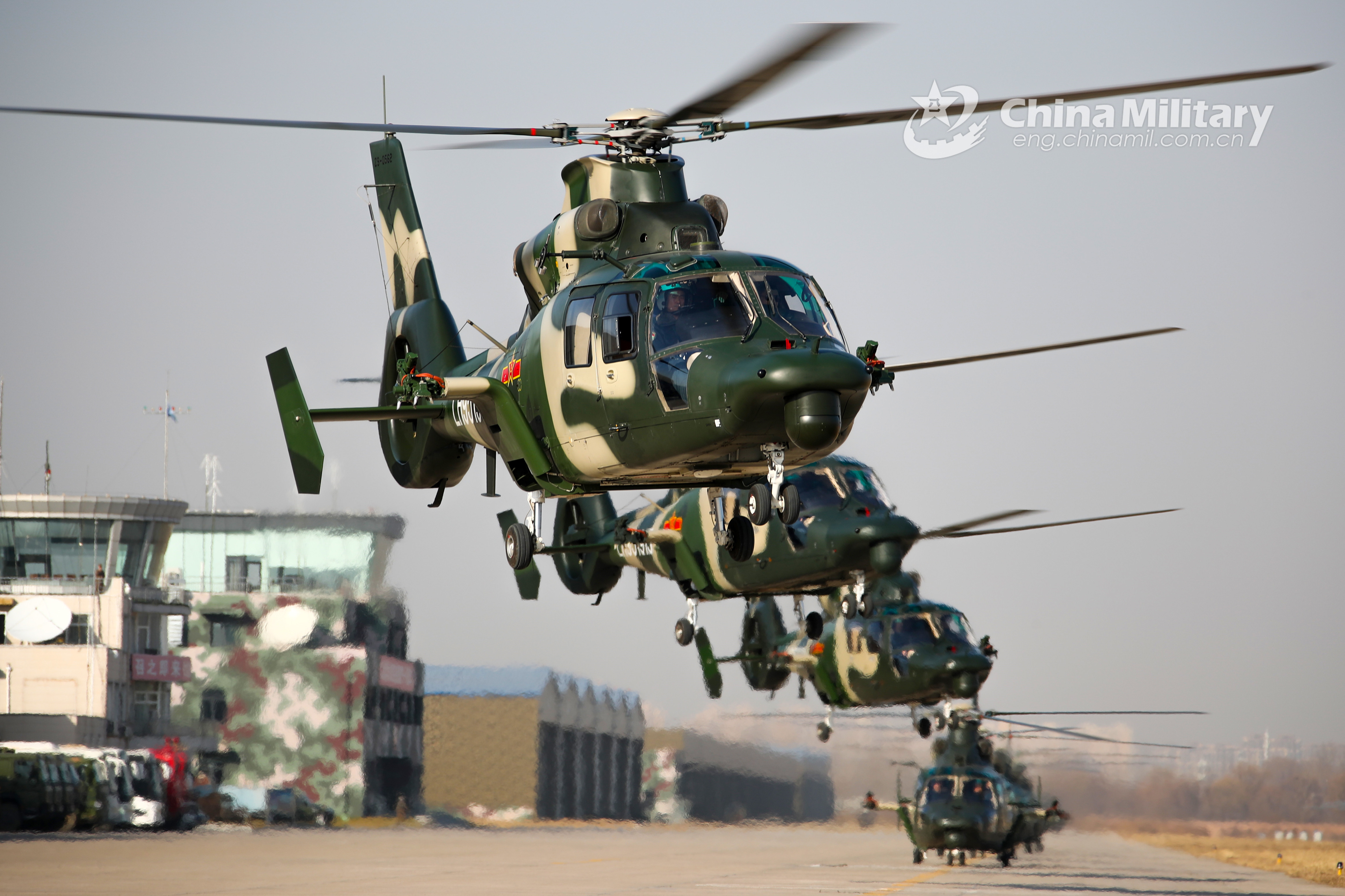A cluster of Z-9 transport helicopters attached to an army aviation brigade under the PLA 81st Group Army execute hover checks before leaving for a flight training task on November 25, 2021. (eng.chinamil.com.cn/Photo by Chen Kai)