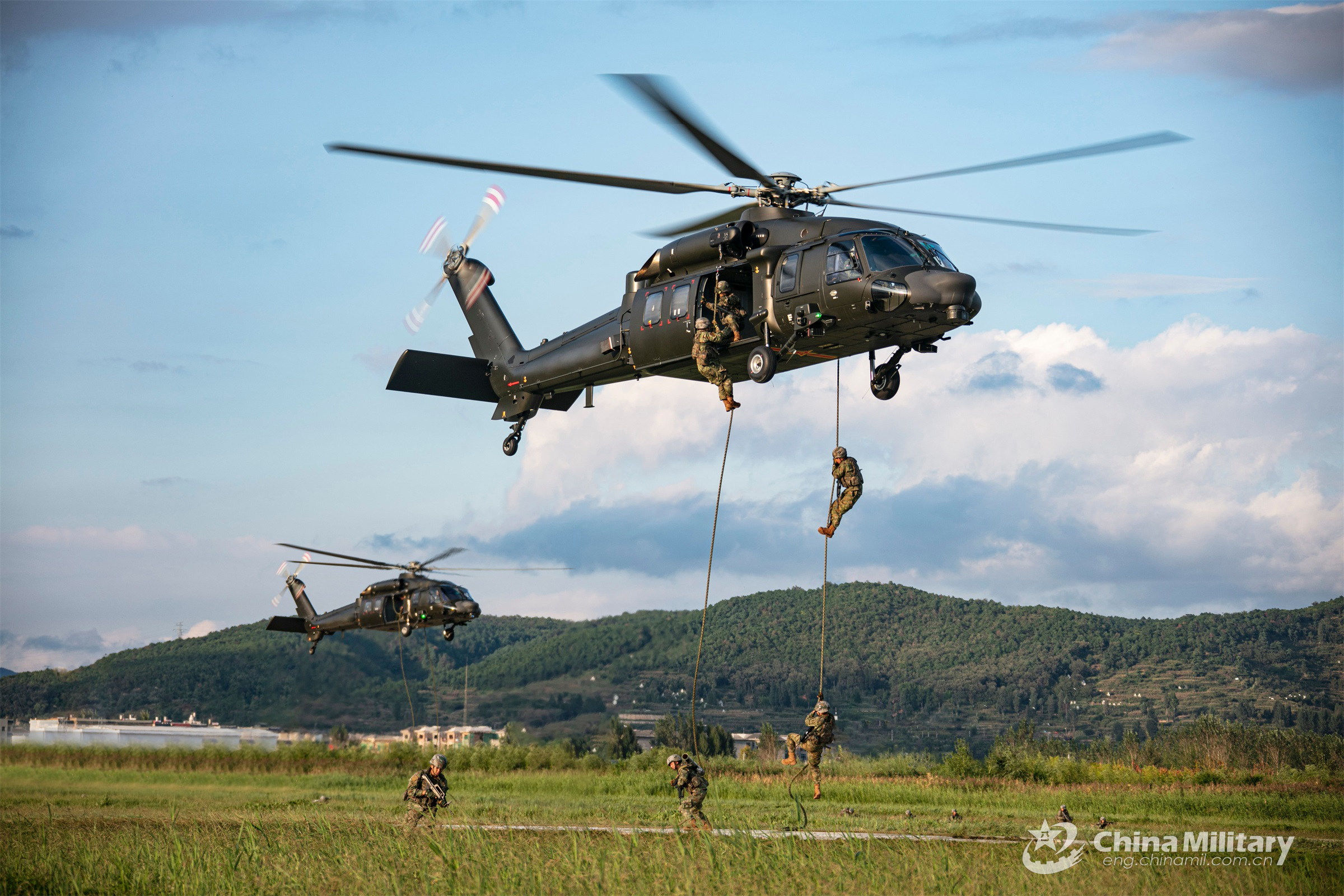 Commandos assigned to a brigade with the army under the PLA Southern Theater Command fast-rope from helicopters during a training exercise in mid-September, 2022. (eng.chinamil.com.cn/Photo by Li Chunguo)
