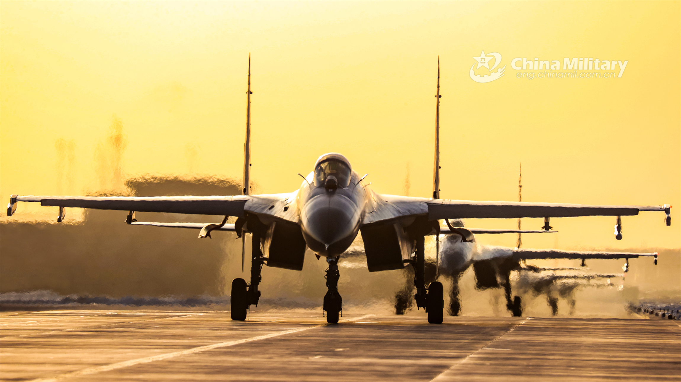 Fighter jets attached to a brigade of the PLA Air Force Xi'an Flying College taxi on the runway to get ready for a real-combat flight training exercise in mid-March, 2023. (eng.chinamil.com.cn/Photo by Cui Baoliang)