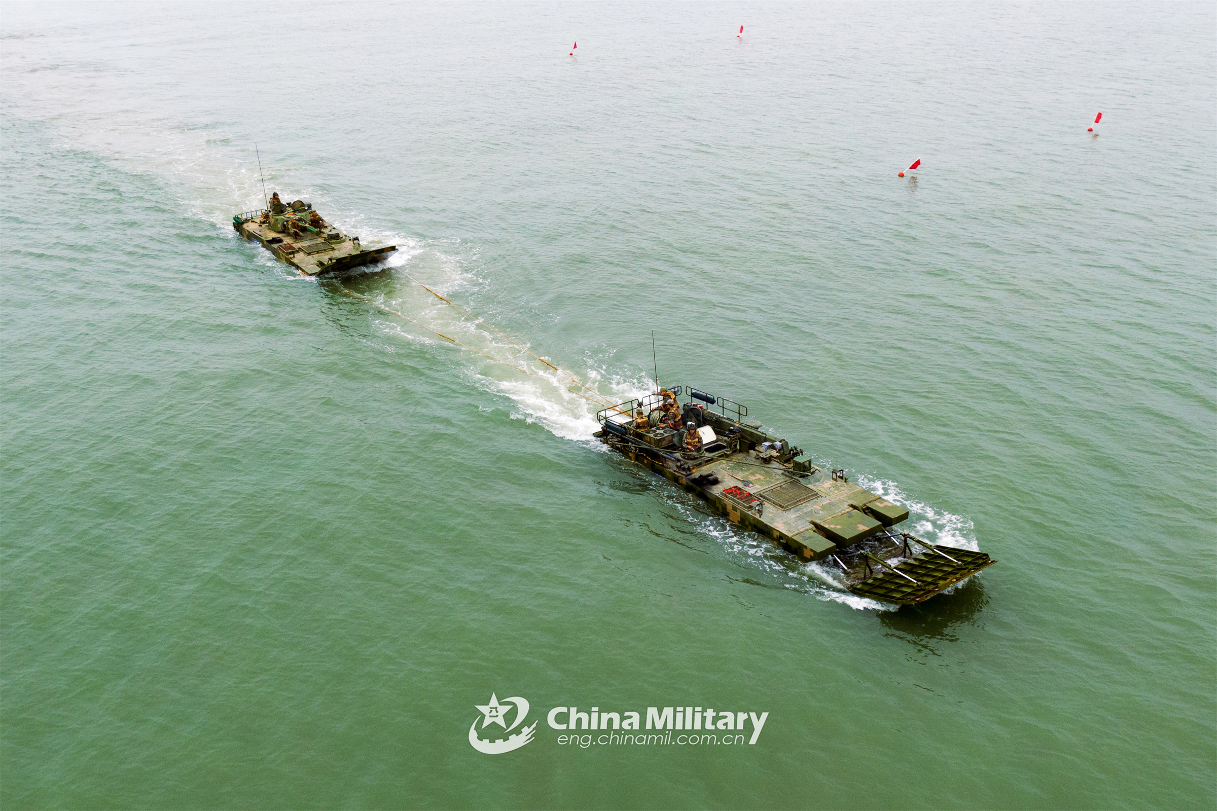 An amphibious armored vehicle for emergency rescue attached to a combined-arms brigade under the PLA 73rd Group Army tows another vehicle toward the coast during a maritime towing and rescue exercise in late April, 2023. (eng.chinamil.com.cn/Photo by Peng Zhifu)