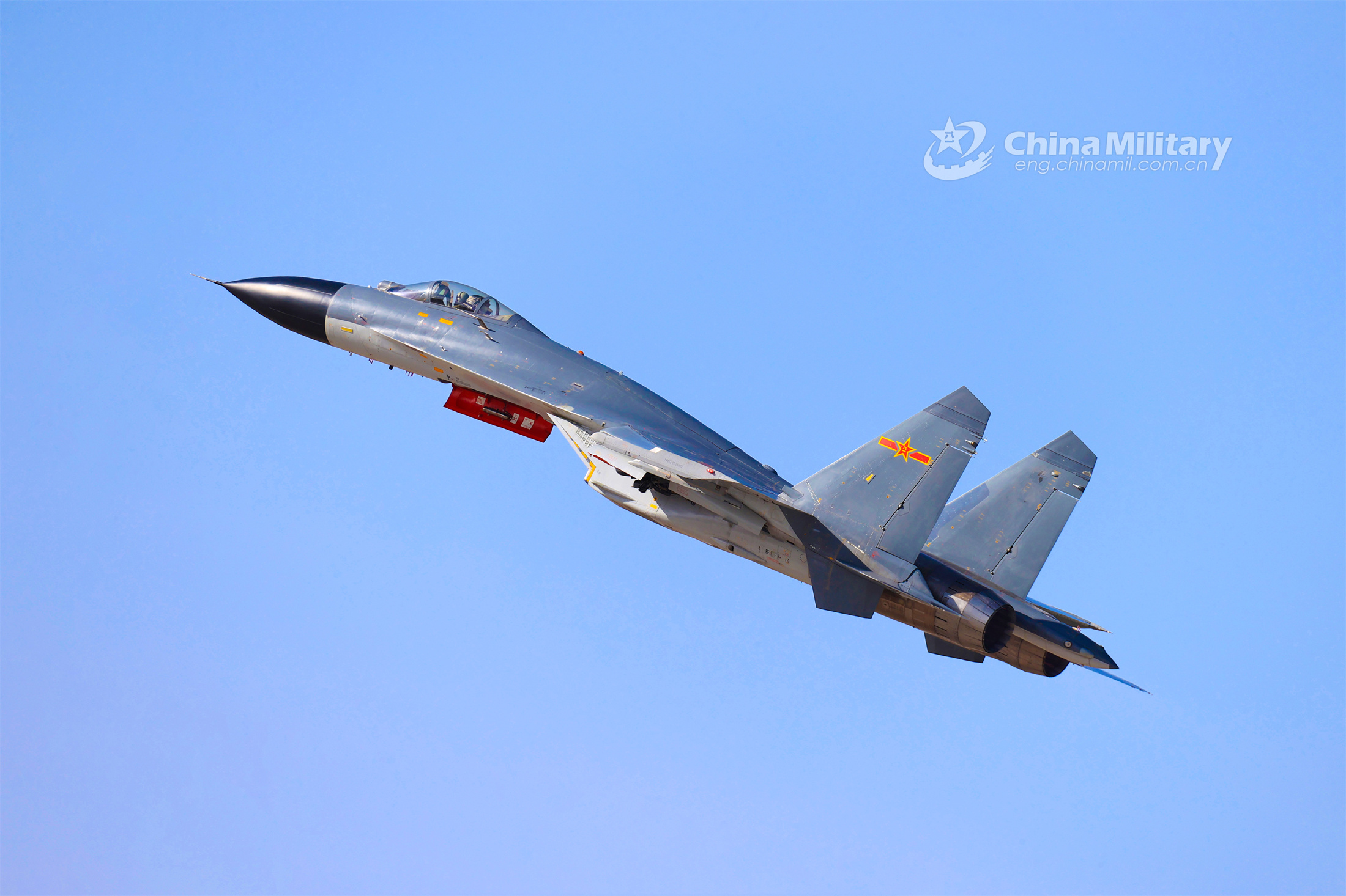 A fighter jet attached to a brigade under the PLA Air Force Xi'an Flying College soars in the sky during a flight training exercise on June 13, 2023. (eng.chinamil.com.cn/Photo by Cui Baoliang)