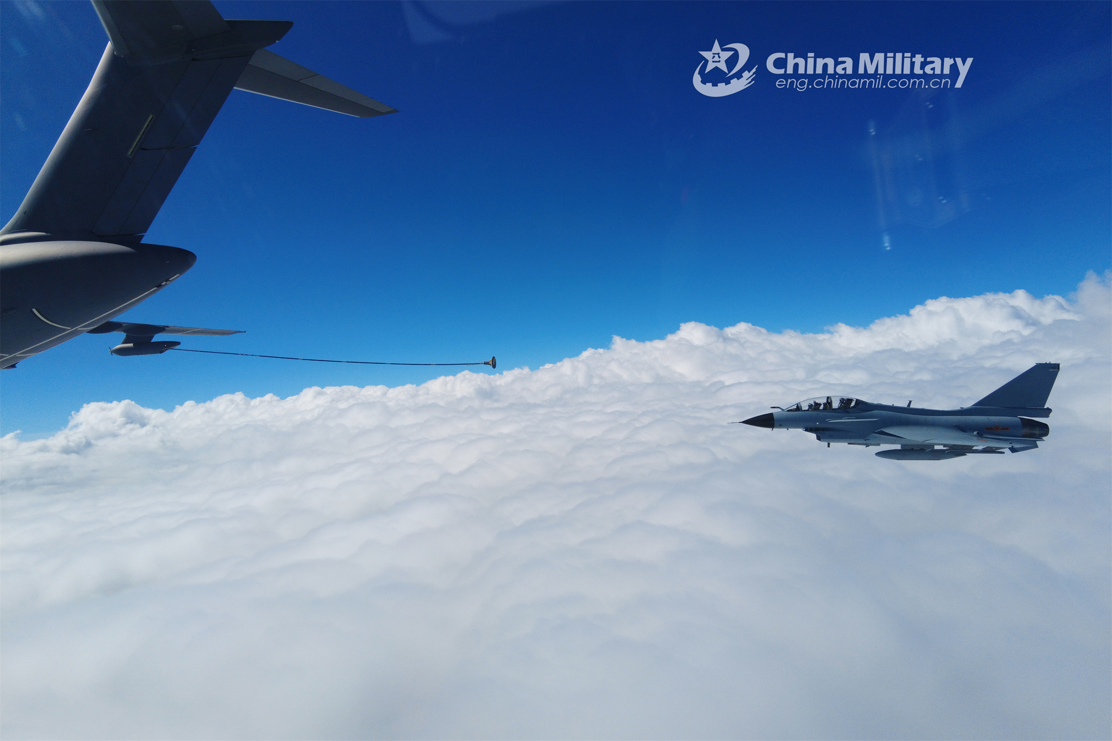 A J-10 fighter jet attached to an aviation brigade of the air force under the PLA Southern Theater Command approaches an YY-20 tanker during a recent flight training exercise. (eng.chinamil.com.cn/Photo by Zhao Jin)
