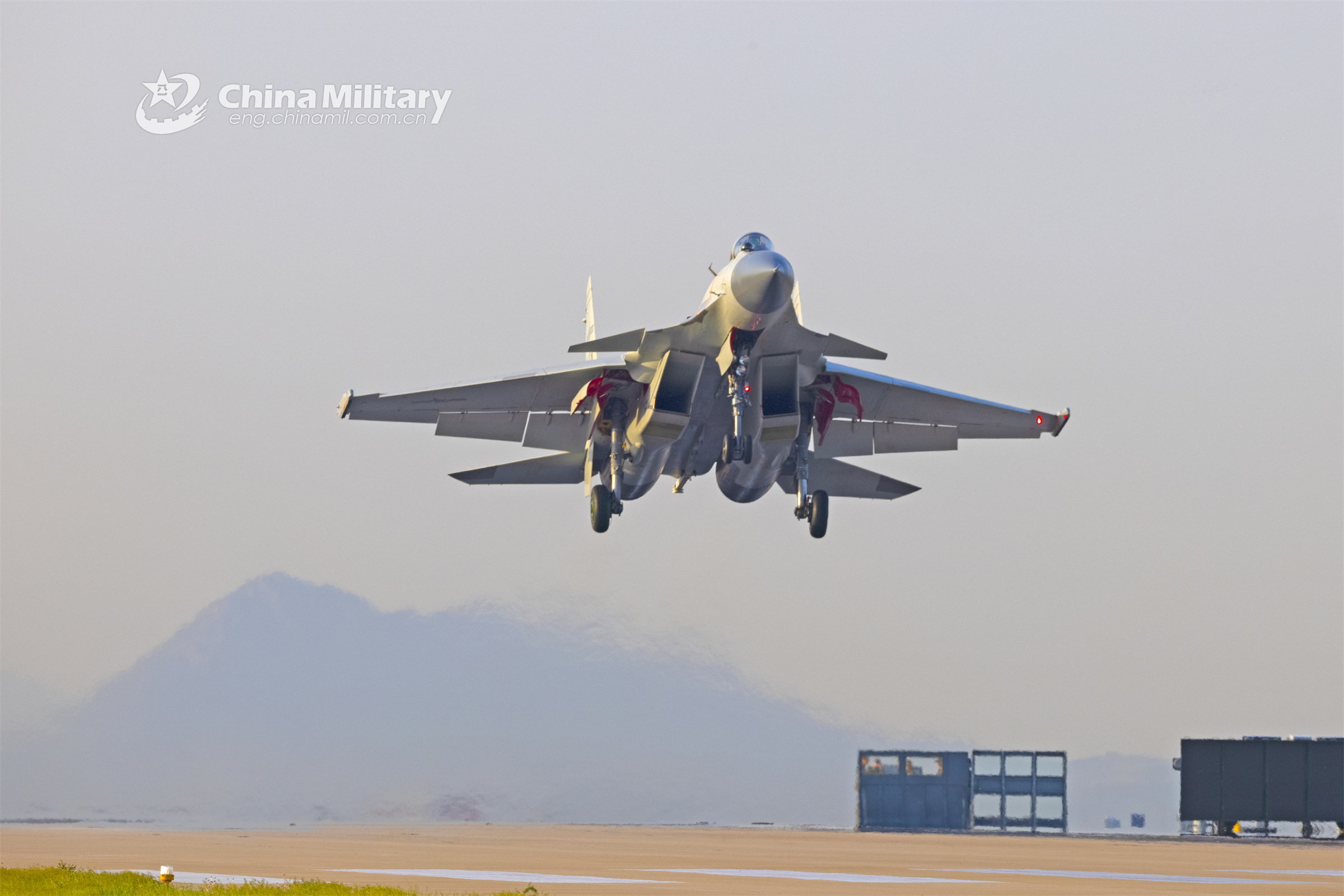 A J-15 carrier-based fighter jet attached to the PLA Naval Aviation University practices simulation of deck landing during a recent flight training exercise. (eng.chinamil.com.cn/Photo by Jiang Tao)