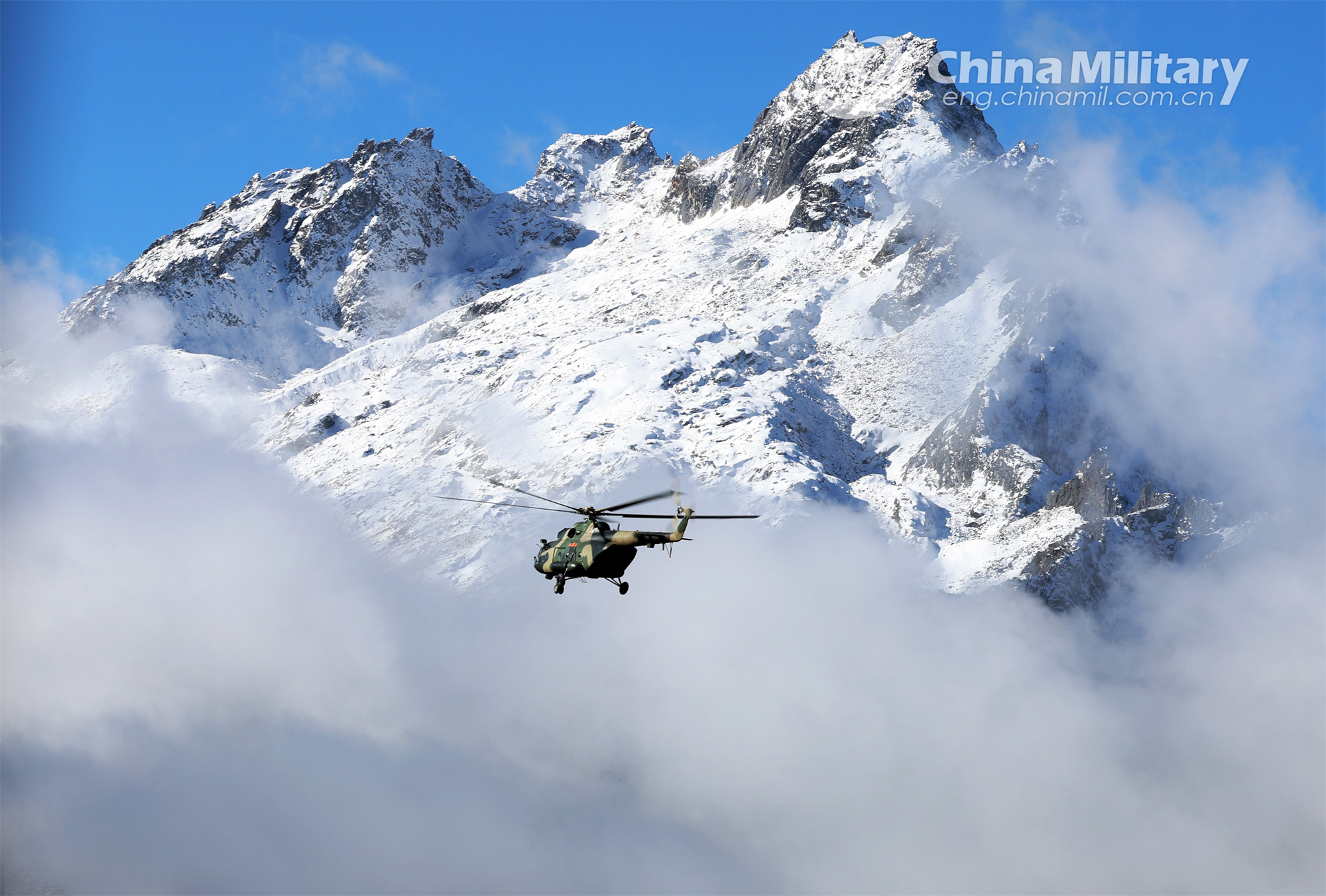 A helicopter attached to an army aviation brigade under the PLA Xizang Military Command flies in a mountainous area during the reconnaissance training in harsh environmental conditions on November 26, 2023. (eng.chinamil.com.cn/Photo by Hu Qiwu)