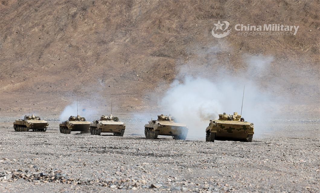 Armored vehicles attached to an armored detachment of a regiment under the PLA Xinjiang Military Command kicks up plumes of dust en route to a designated area during a 3-day driving skill training exercise from February 10 to 12, 2024. (eng.chinamil.com.cn/Photo by Liu Tao)