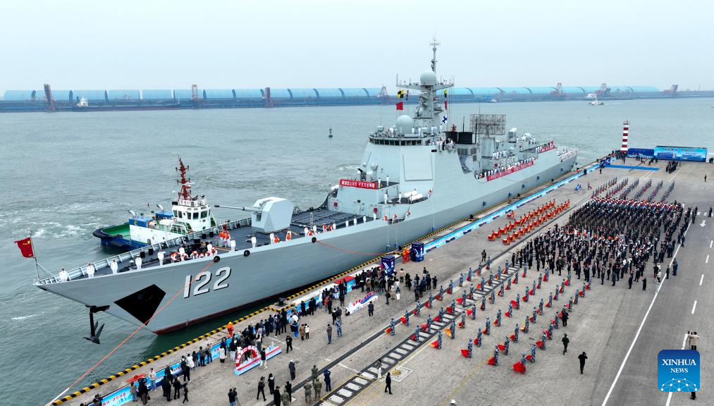 This aerial drone photo taken on April 20, 2024 shows naval vessel Tangshan docking at Tangshan City, north China's Hebei Province. This year marks the 75th founding anniversary of the Chinese People's Liberation Army (PLA) Navy. (Photo by Ma Yubin/Xinhua)