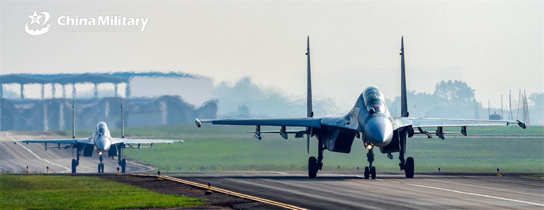 Fighter jets attached to an aviation brigade with the air force under the PLA Southern Theater Command taxi on the runway in formation during a flight training exercise on April 19, 2024. (eng.chinamil.com.cn/Photo by Zhao Yutong)